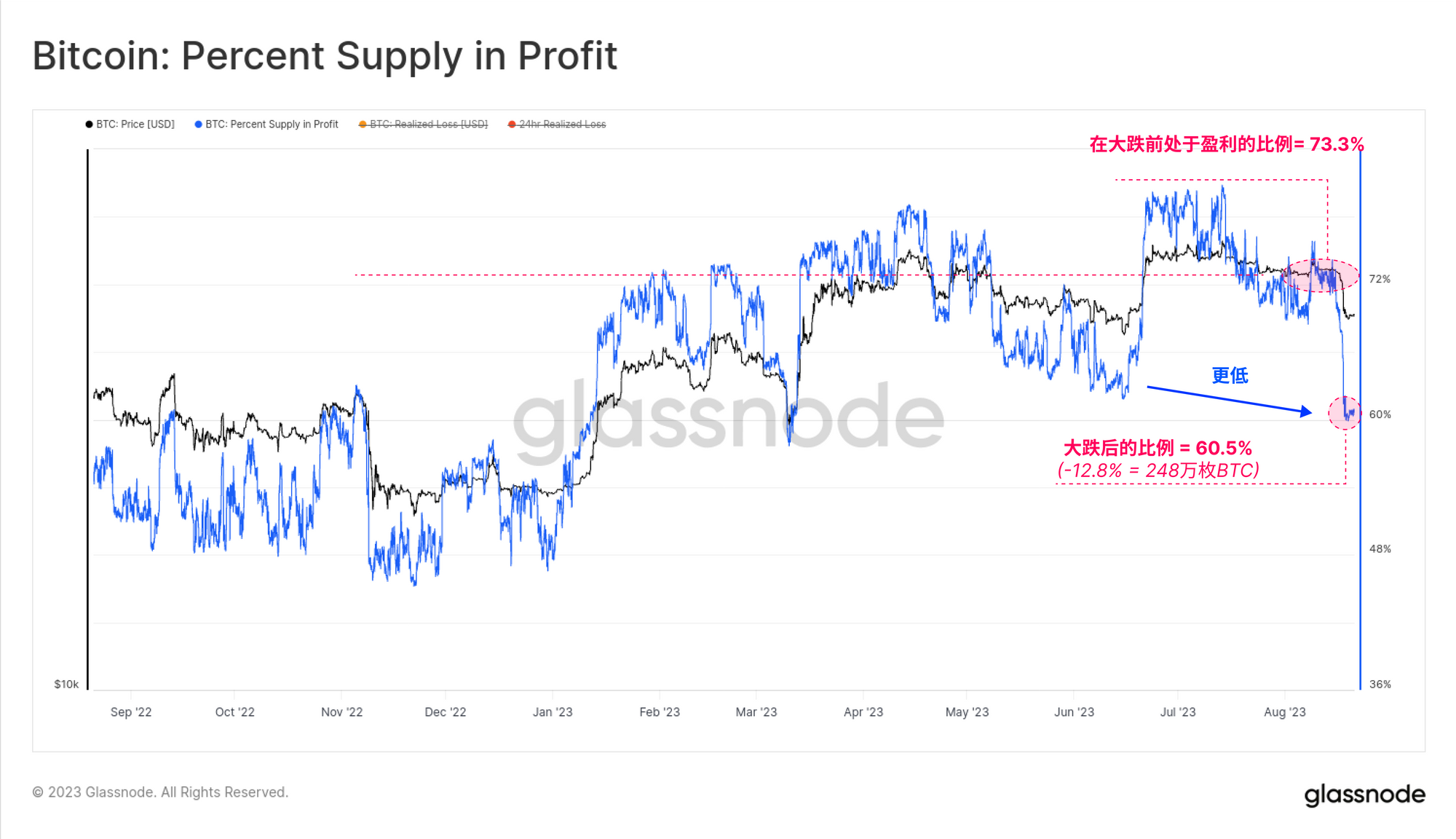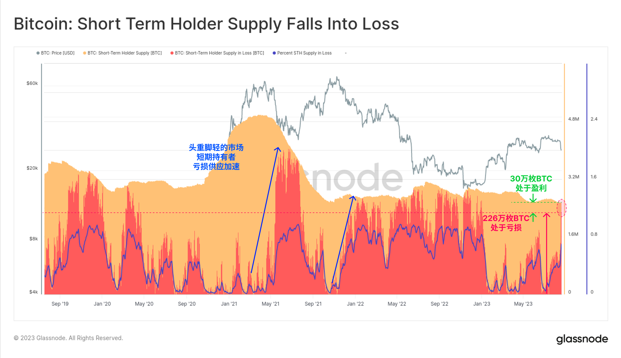 - 现货市场仍然相对 "头重脚轻",超过88.3%的短期持有者供应目前处于未实现亏损状态。