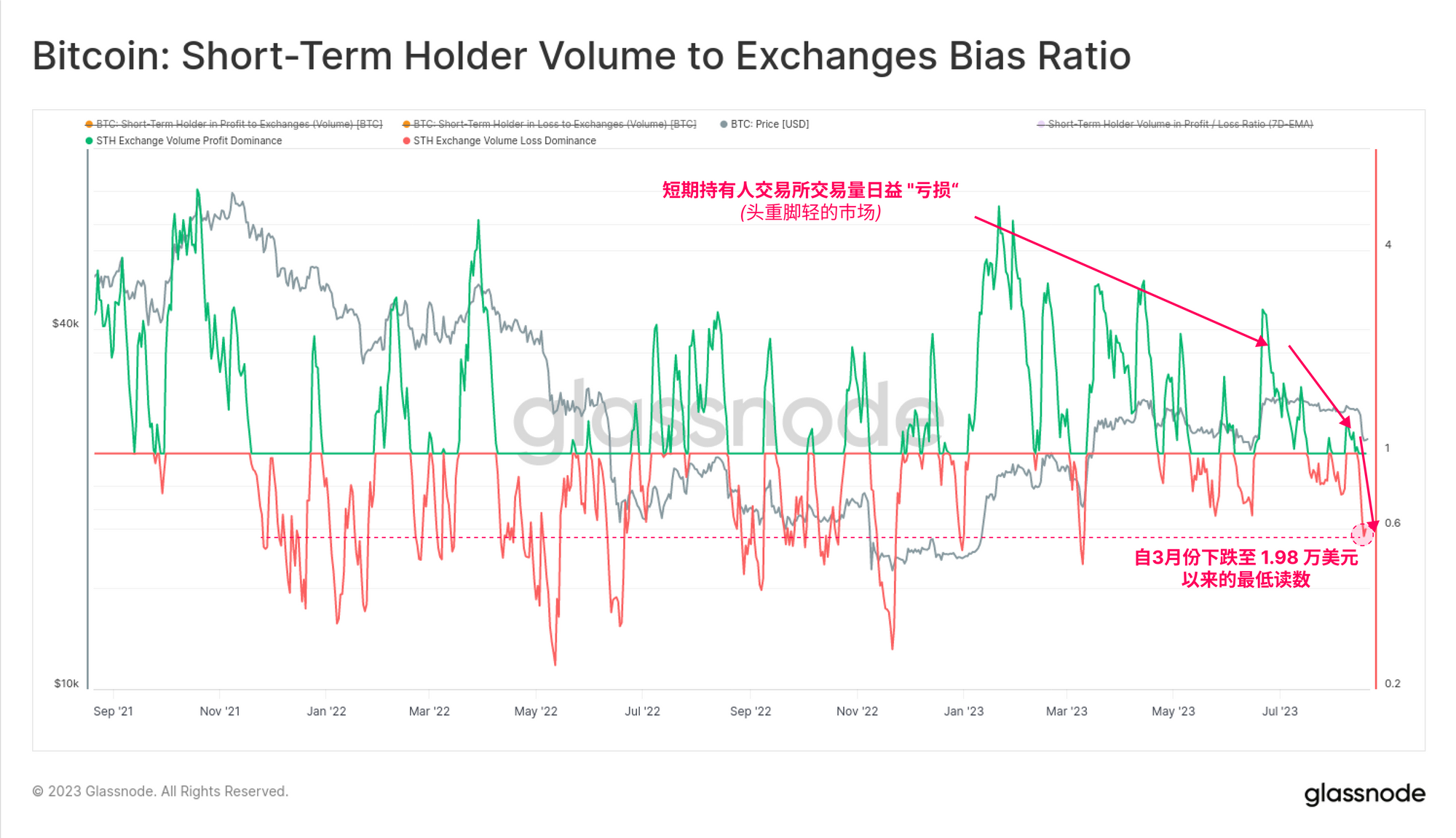 下一张图表显示了流入交易所的STH交易量的盈利或亏损倾向(主导地位)。我们可以看到,随着 2023 年涨势的推进,随着越来越多的STH 购入成本基础越来越高的币,盈利优势在稳步下降。