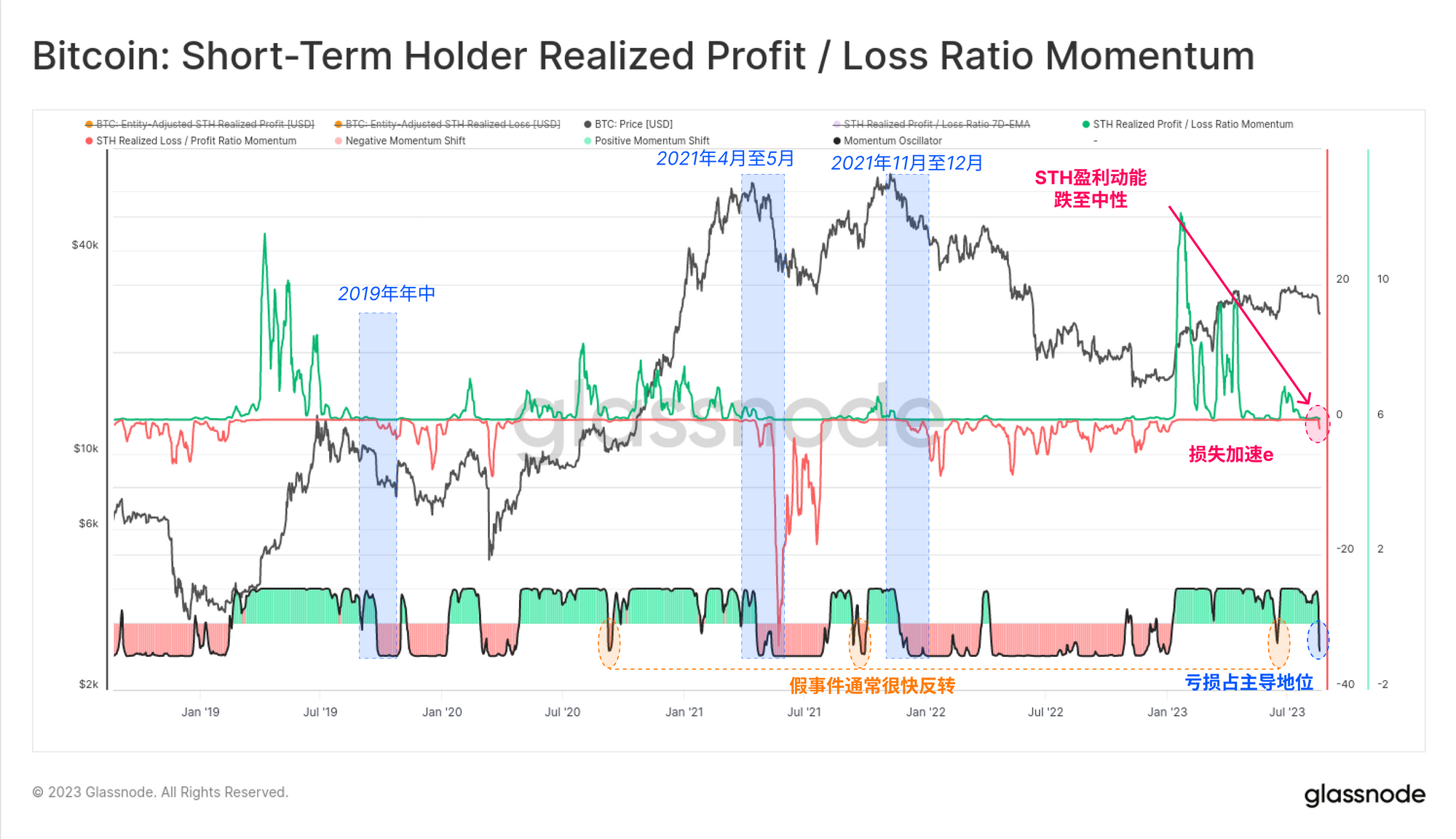 下图所示的这一指标的变体专门针对短期持有者,他们是对市场波动反应最灵敏的群体。我们可以看到,在经历了几个月的利润优势下降之后,亏损动能和优势已经显著增强。虽然偶尔会有误导性的信号,如2023年3月的短暂调整,但从长远来看,这些误导性信号往往很快得到修正。