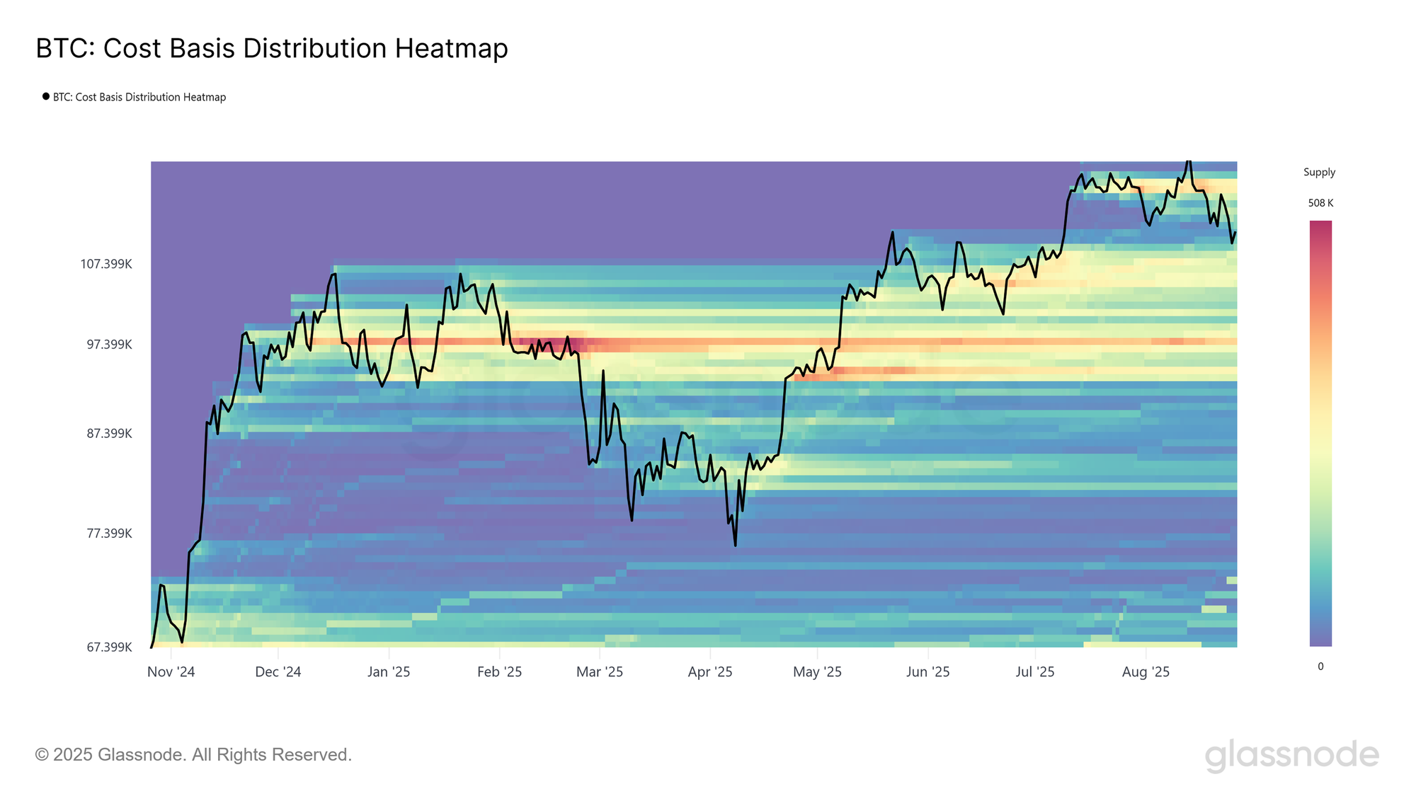 CBD热力图提供了供应在不同买入价格下的集中分布可视化,突出显示了大量币最后一次易手的位置。每一个颜色带都反映了密集的成本基础区域,这些区域通常充当天然的支撑或阻力位。