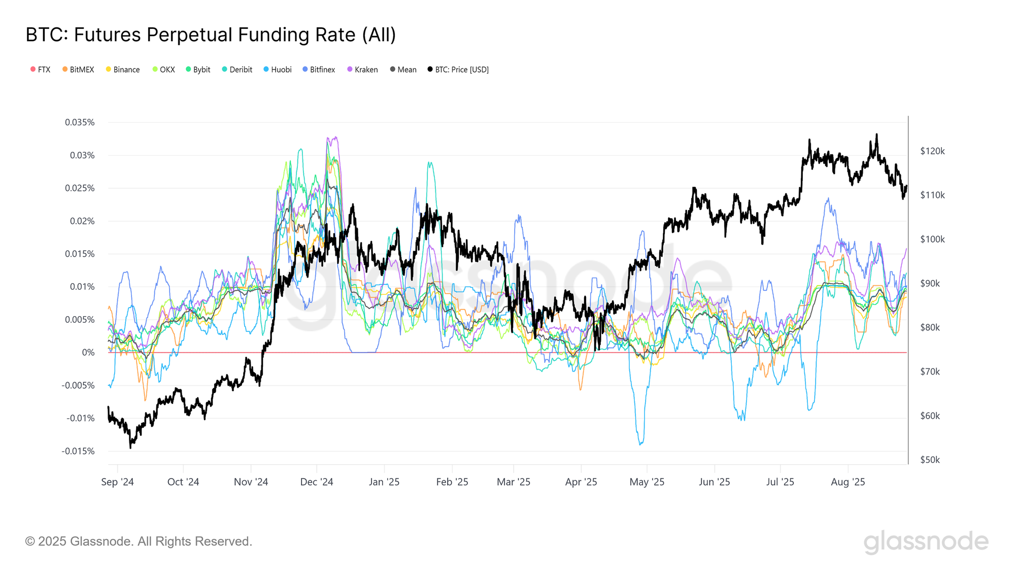 为了确认永续市场的整体情绪,我们可以将CVD分析与资金费率结合起来,后者追踪持有多头与空头仓位的成本。主要交易所的资金费率7日移动平均目前接近0.01%,其中夹杂着个别交易所的短暂高值。