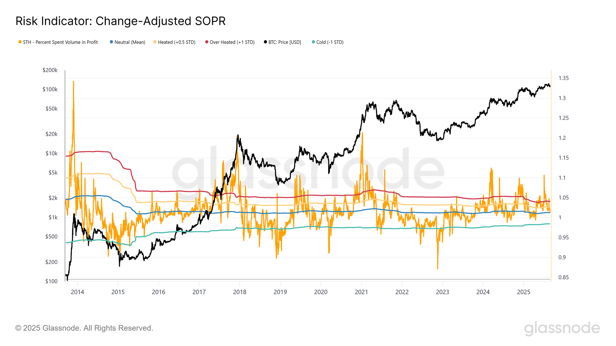 目前,经过调整的SOPR 7日移动平均值(已过滤掉内部转账)接近中性值1。这表明大多数活跃投资者既未实现显著收益,也未实现显著亏损,反映出市场不确定性。