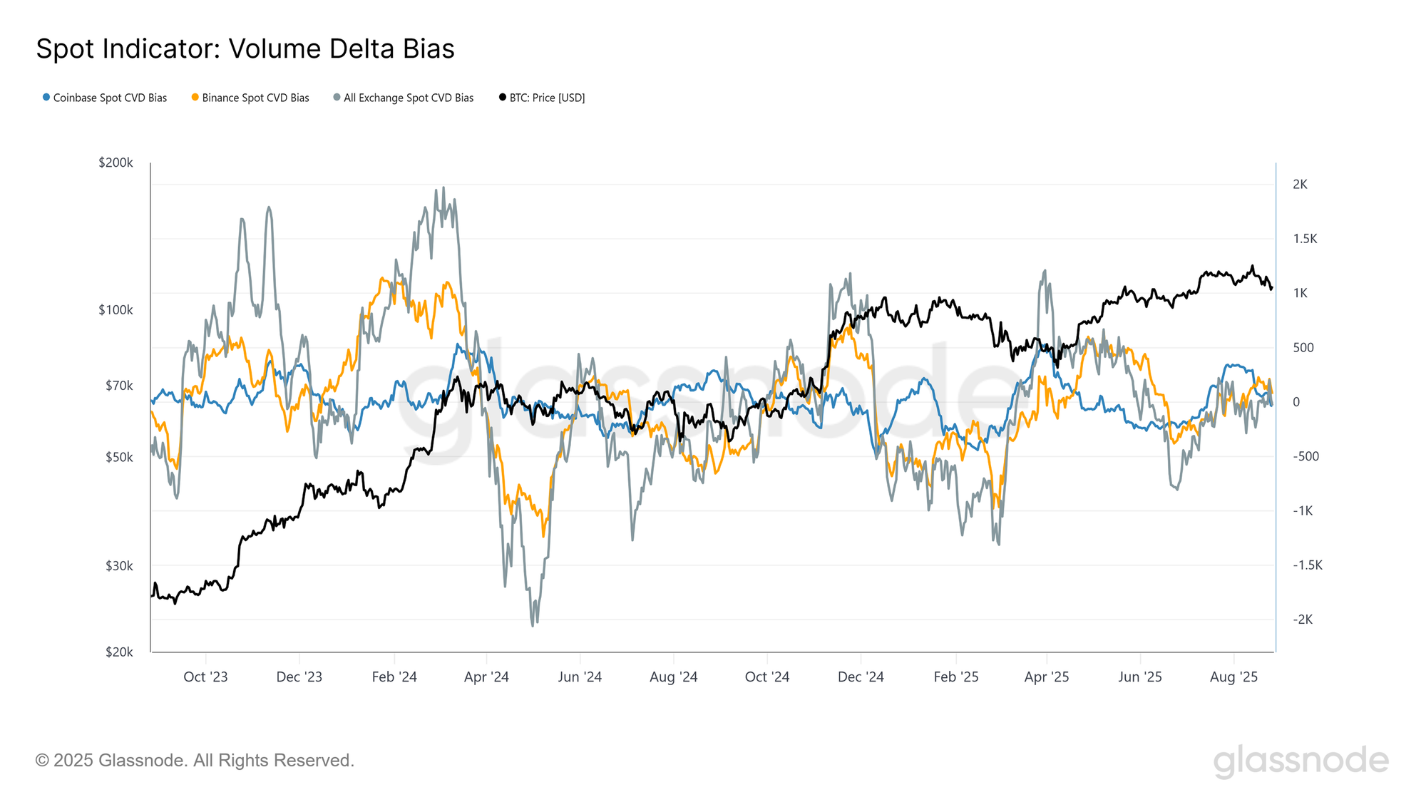 为了衡量现货市场行为的变化,我们将CVD的30日移动平均与其180日中位数进行比较。在Coinbase和Binance等主要交易所,以及汇总的交易所资金流中,这一偏差最近已趋向于零。这与2025年4月观察到的强劲买盘形成了显著对比,当时的买压推动了价格自7.2万美元反弹。虽然7月的一次小幅正向激增推动了价格上涨至12.4万美元,但更广泛的趋势如今反映出现货情绪的中性化,表明买方在当前价位的信心减弱。