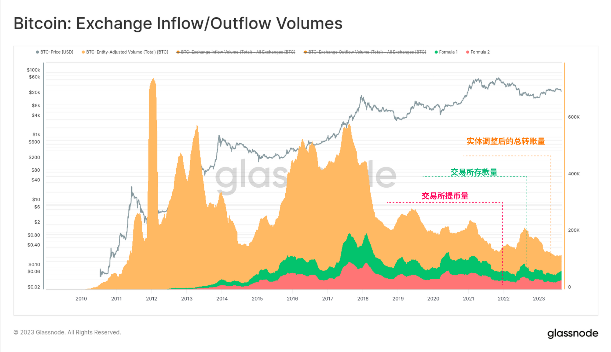 - 依据我们的数据调整和分析,与交易平台的存取款活动相关的比特币链上经济交易量高达54%,这一数据为我们的分析提供了有力支撑。