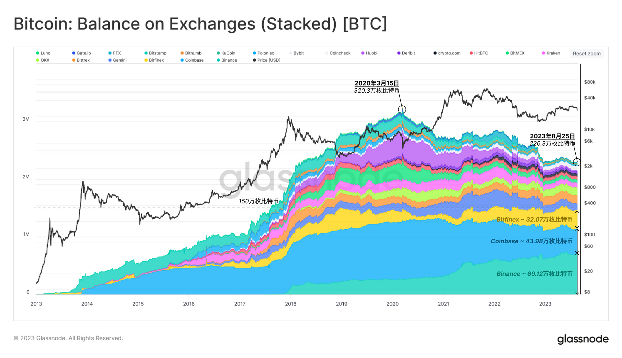 该图表的一个显著特点是前三大交易所的主导地位,自2019 年初以来,它们一直持有约150万枚BTC。这些交易所目前持有的供应量估计如下: