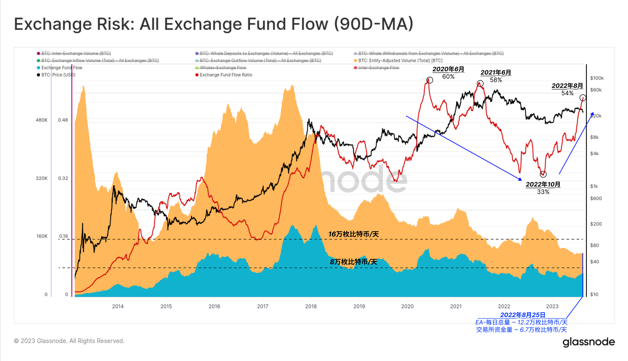 我们可以看到,与交易所相关的资金流(54%)🔵目前总体占主导地位,接近历史最高水平。