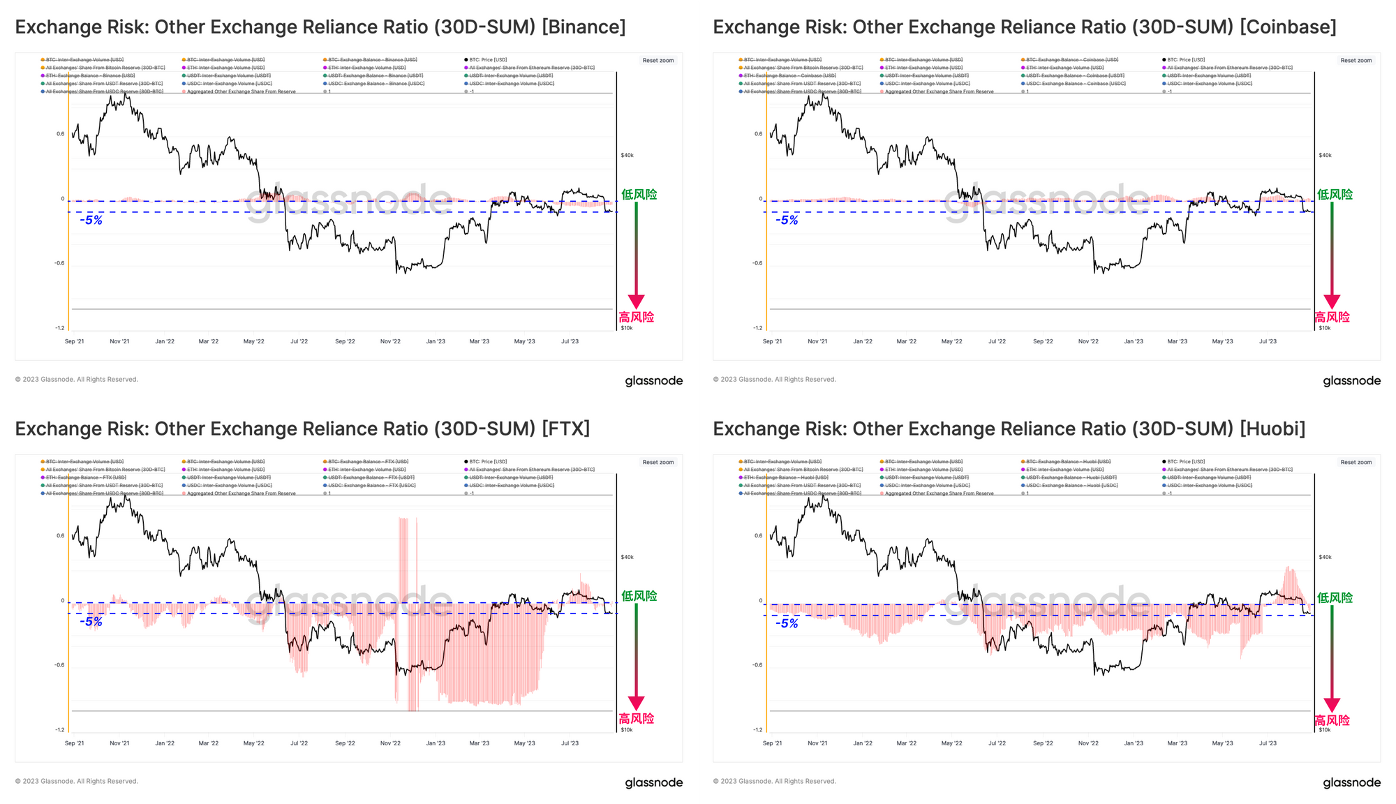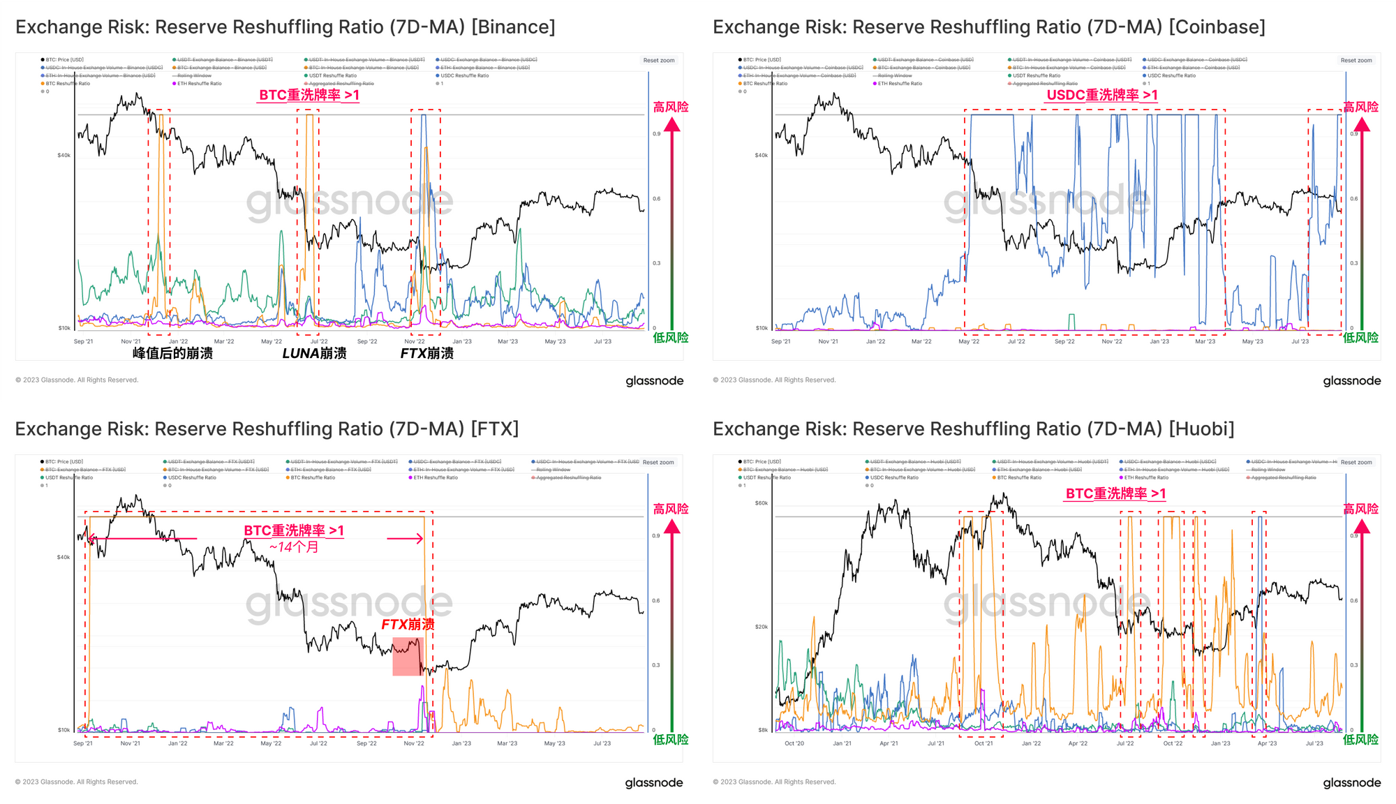 - FTX(左下角):[T在该交易所倒闭前的 14个月里,比特币的洗牌率显示出高风险状态。事后看来,这很可能是Alameda挪用客户资金的结果。