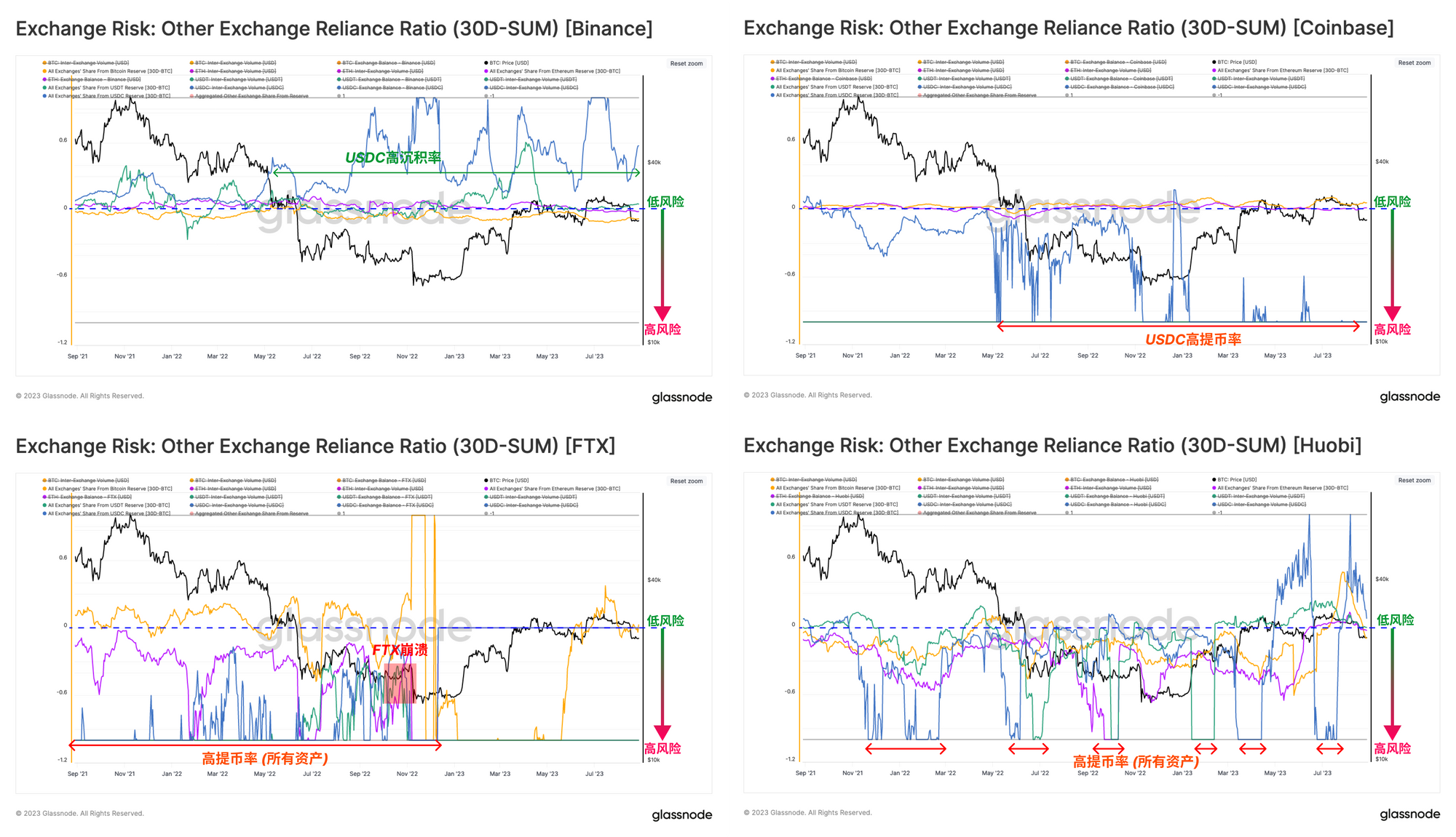 - Coinbase(右上角):与 Binance 类似,所有资产都显示出中性的依赖比率。然而,自2022年9月以来,USDC 指标显示出较高的流出率。这表明,在过去12个月中,大量的USDC供应已从Coinbase转移到了Binance。