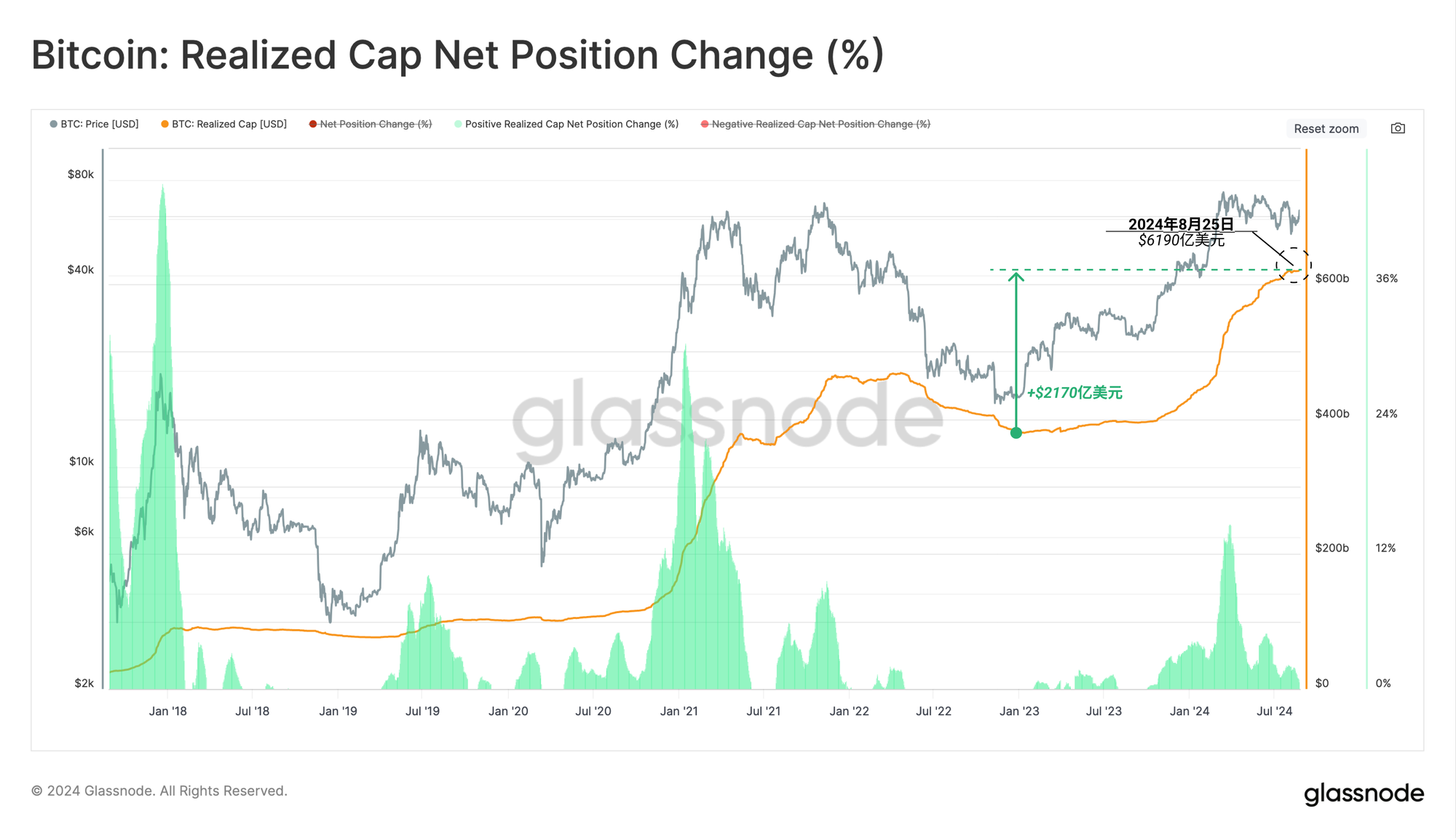已实现市值仍处于6190亿美元的历史高位,自2022年12月建立的1.5万美元低点以来,支持了惊人的2170亿美元净流入。