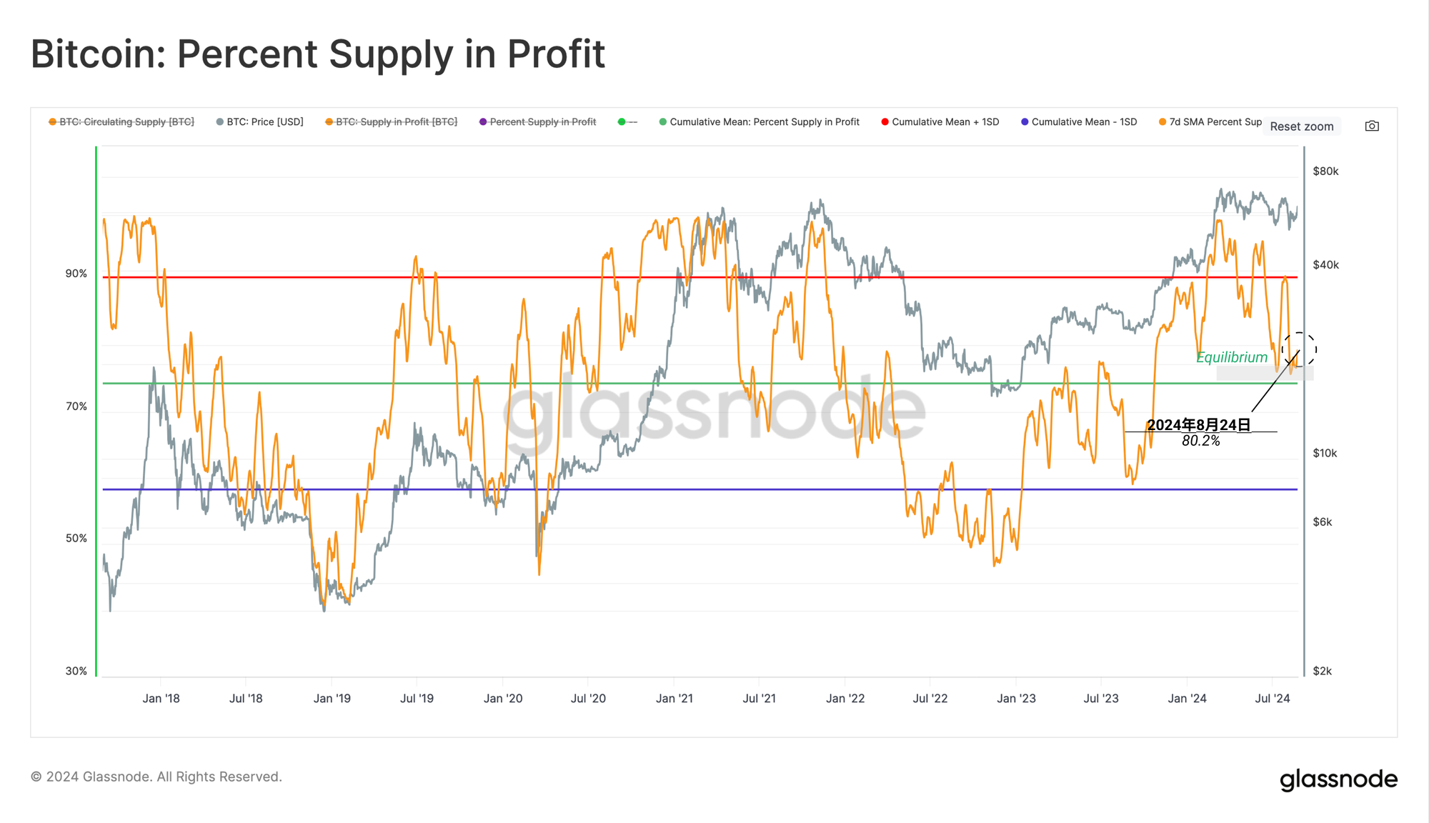 与MVRV比率类似,这个振荡指标已经回到了其长期均值。以前在2016年底、2019年波动时期和2021年中期抛售期间都出现了类似的水平再测试。
