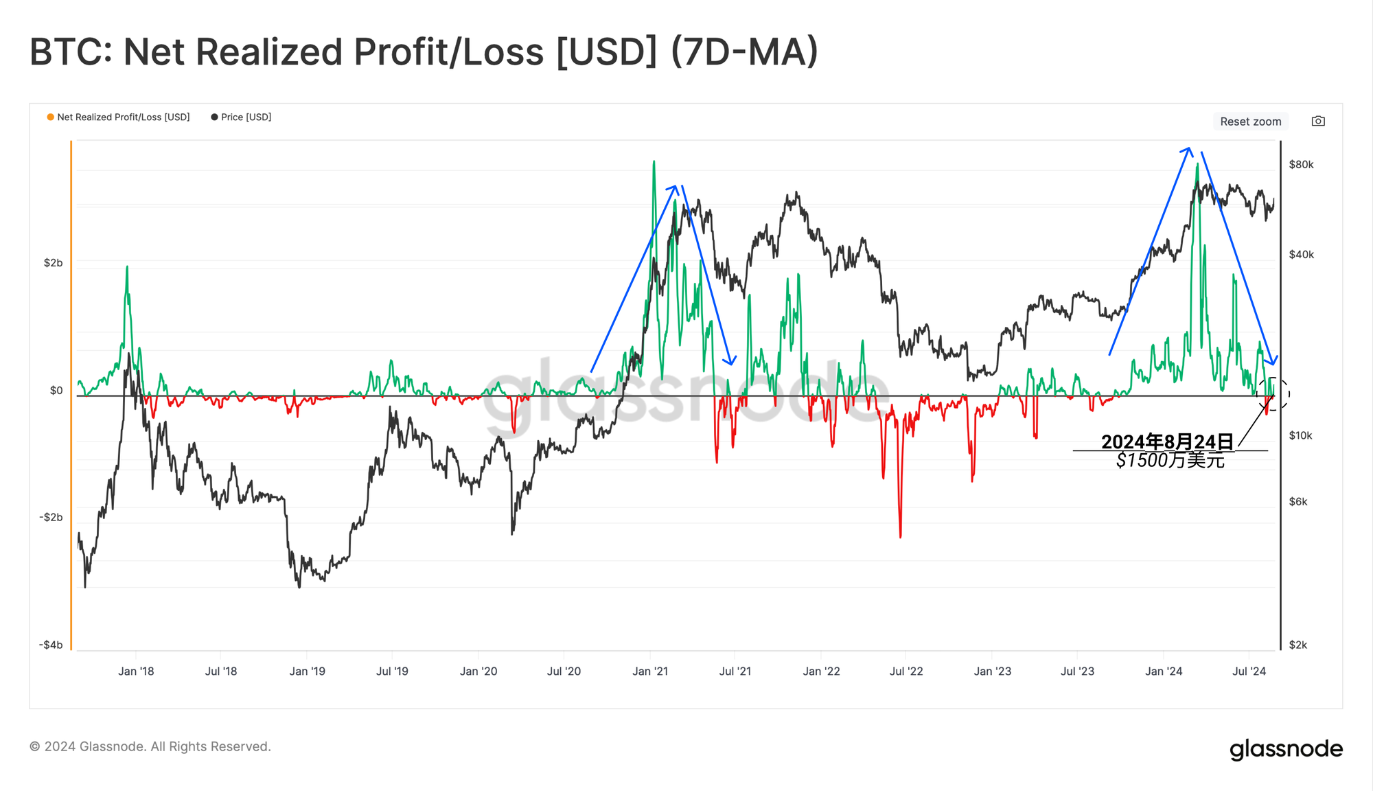 深入分析这些获利和亏损活动,我们可以看到净已实现利润/亏损的幅度正在下降。