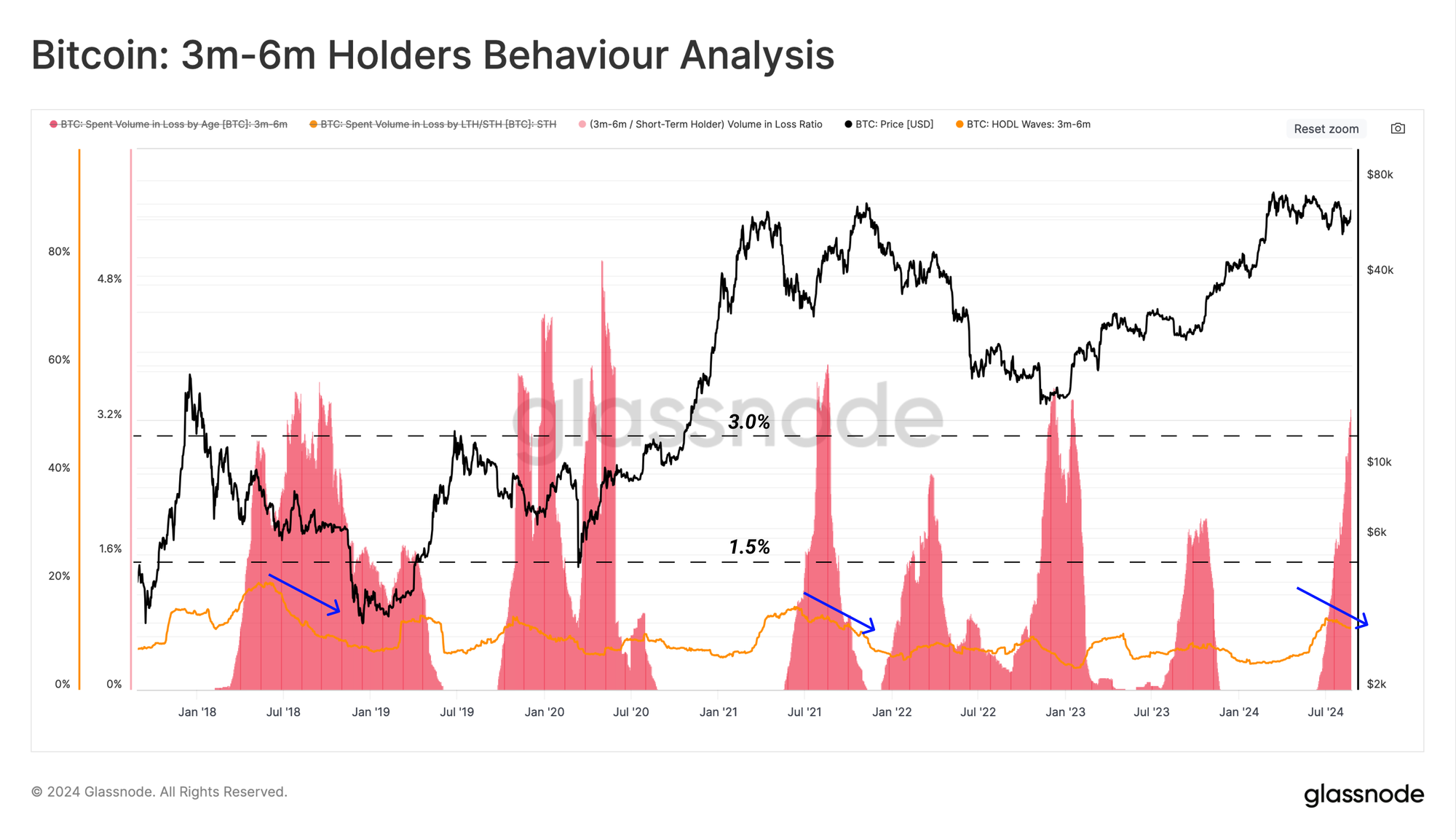 下图旨在进一步分解这一群体,并比较3-6个月龄段的持有供应量与已亏损离场的供应量。我们首先展示了🟠3-6个月龄的持有供应量,然后叠加该群体在亏损情况下转移的交易量🟥。