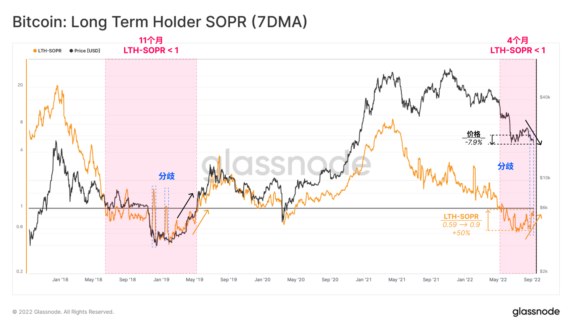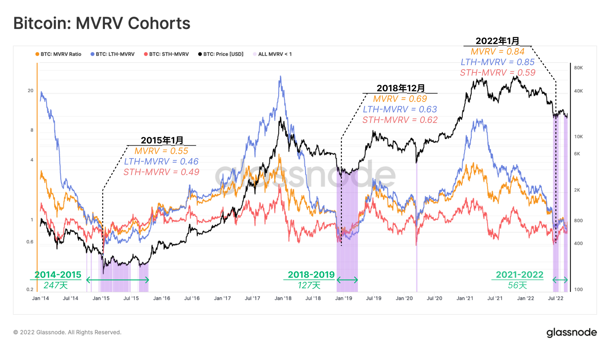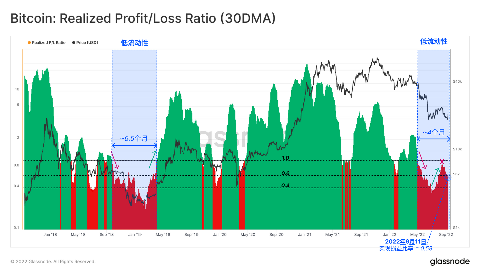 跌破1.0水平和收回1.0水平之间的间隔,是看跌情绪的高峰期,也是因为需求流动性不足。从定性的角度来看,目前的低流动性机制开始于约4个月前,可以与2018-2019年熊市中经历的6个月时间进行比较。