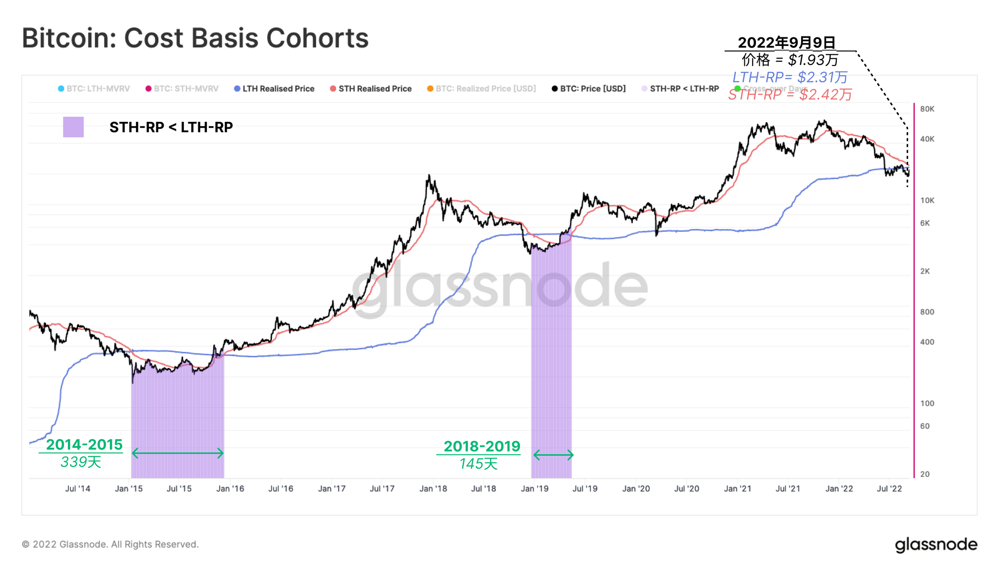 尽管下降趋势持续了10个月,本轮熊市还没有达到交叉阶段。之前的几次熊市中,币价需要横盘145天到339天才能回复。鉴于实现的价格轨迹,我们可以预期在9月中旬会出现交叉。
