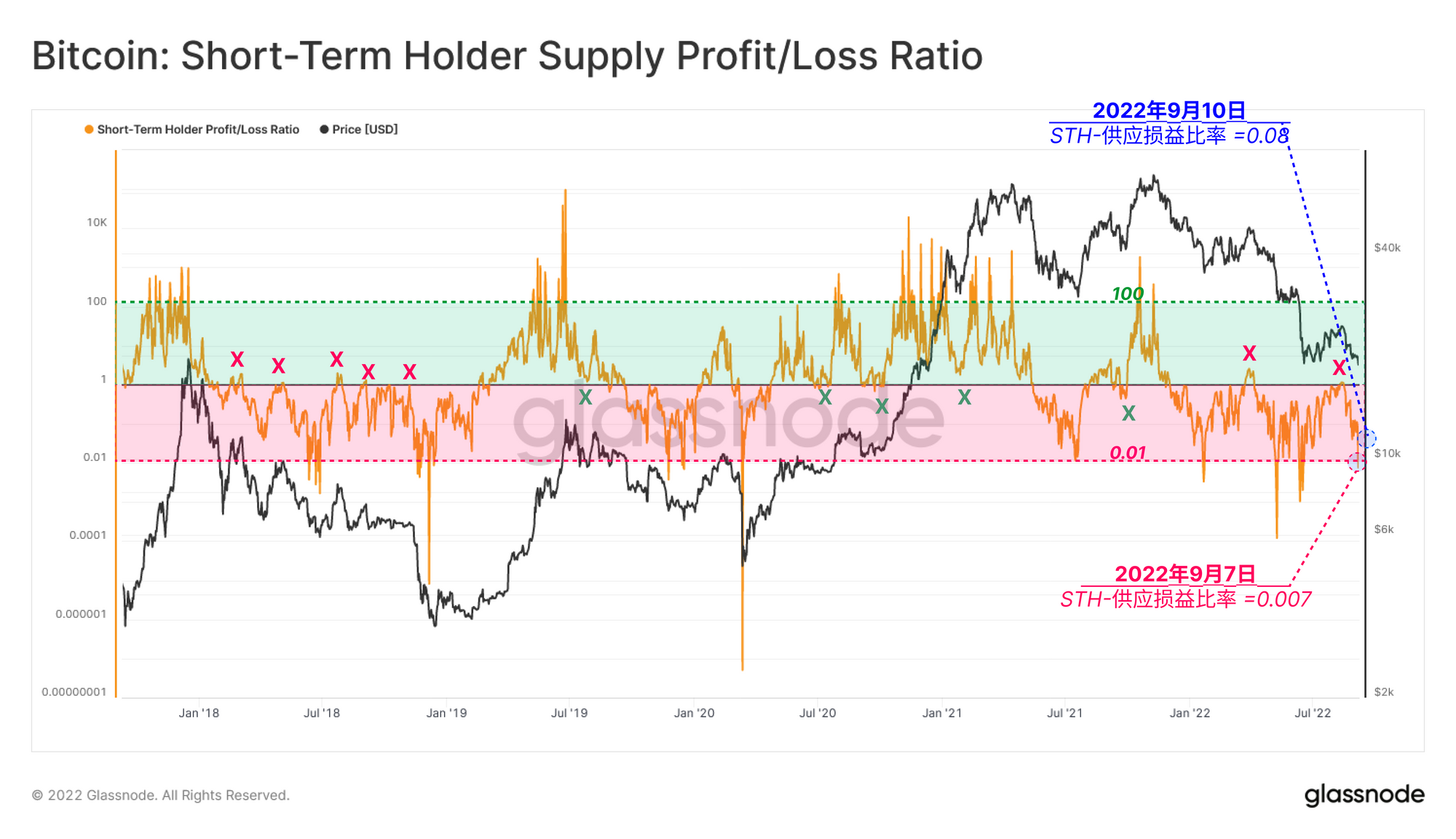 本周比特币交易量比2021年11月的历史前高低72.5%,市场与2018-19年熊市的最后阶段有许多相似之处。最近的熊市反弹到2.45万美元,然后抛售到1.85万美元以下,造成大量的短期持有人供应重新陷入未实现的损失。