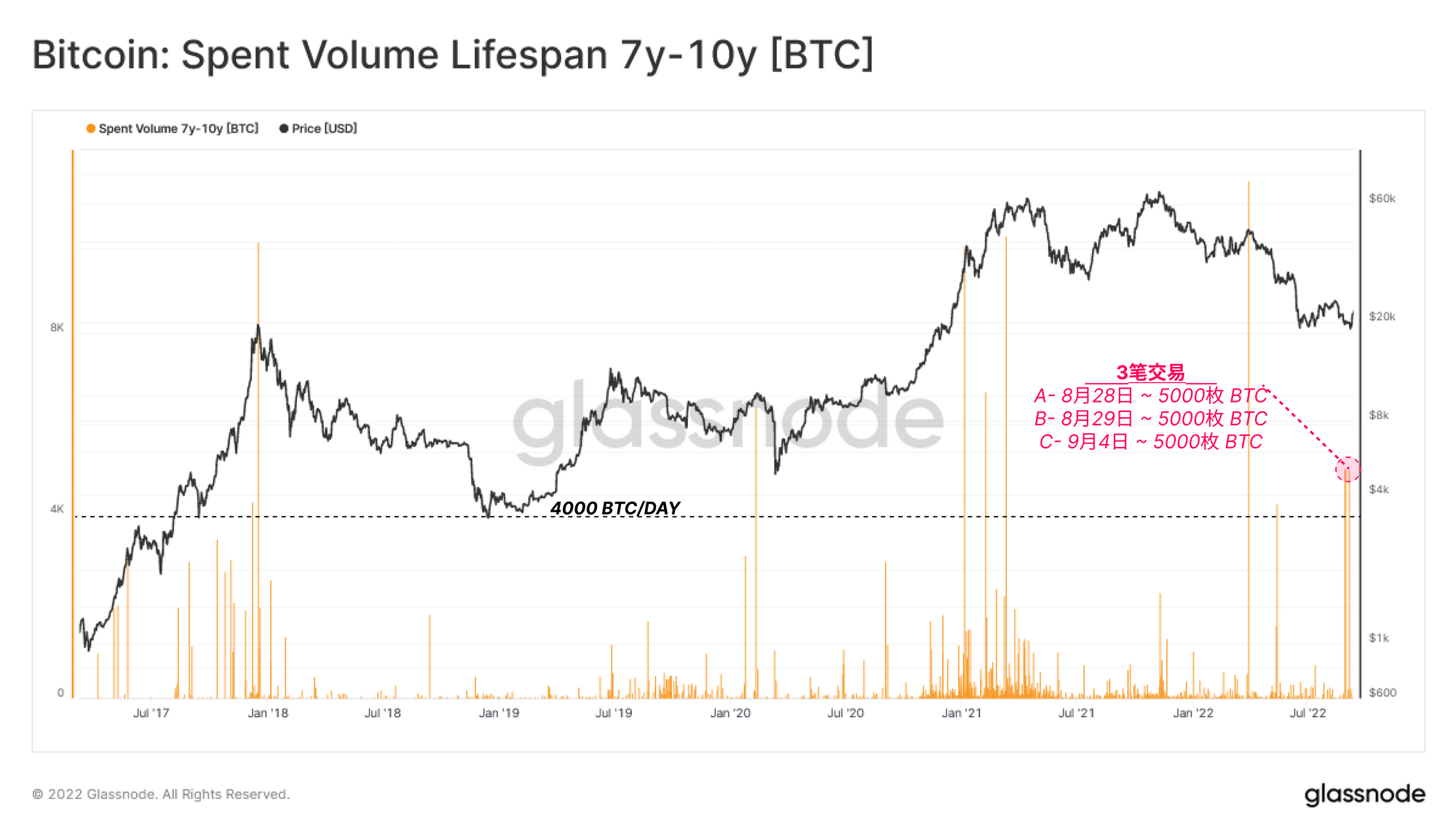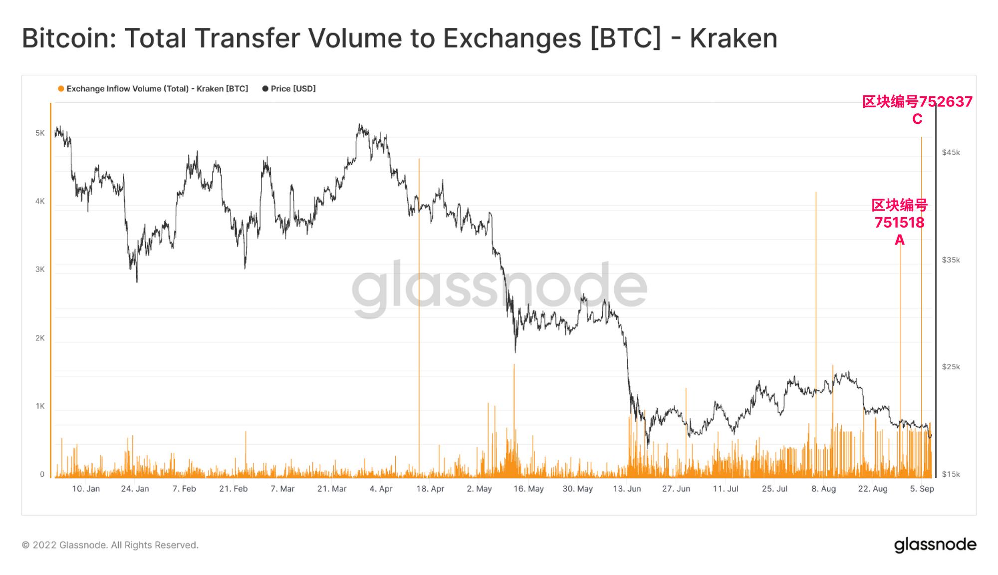 - C- 区块号752637, 2022年9月4日($19.9k), 卖出5,000 BTC (该交易的直接接收者是Kraken交易所), 初始购买日期: 2013年12月19日($543.14)