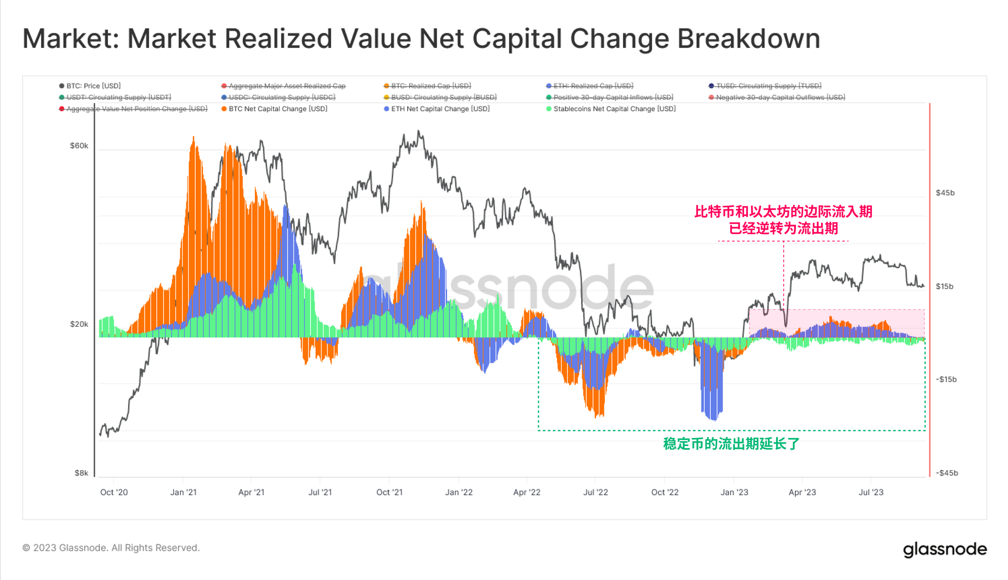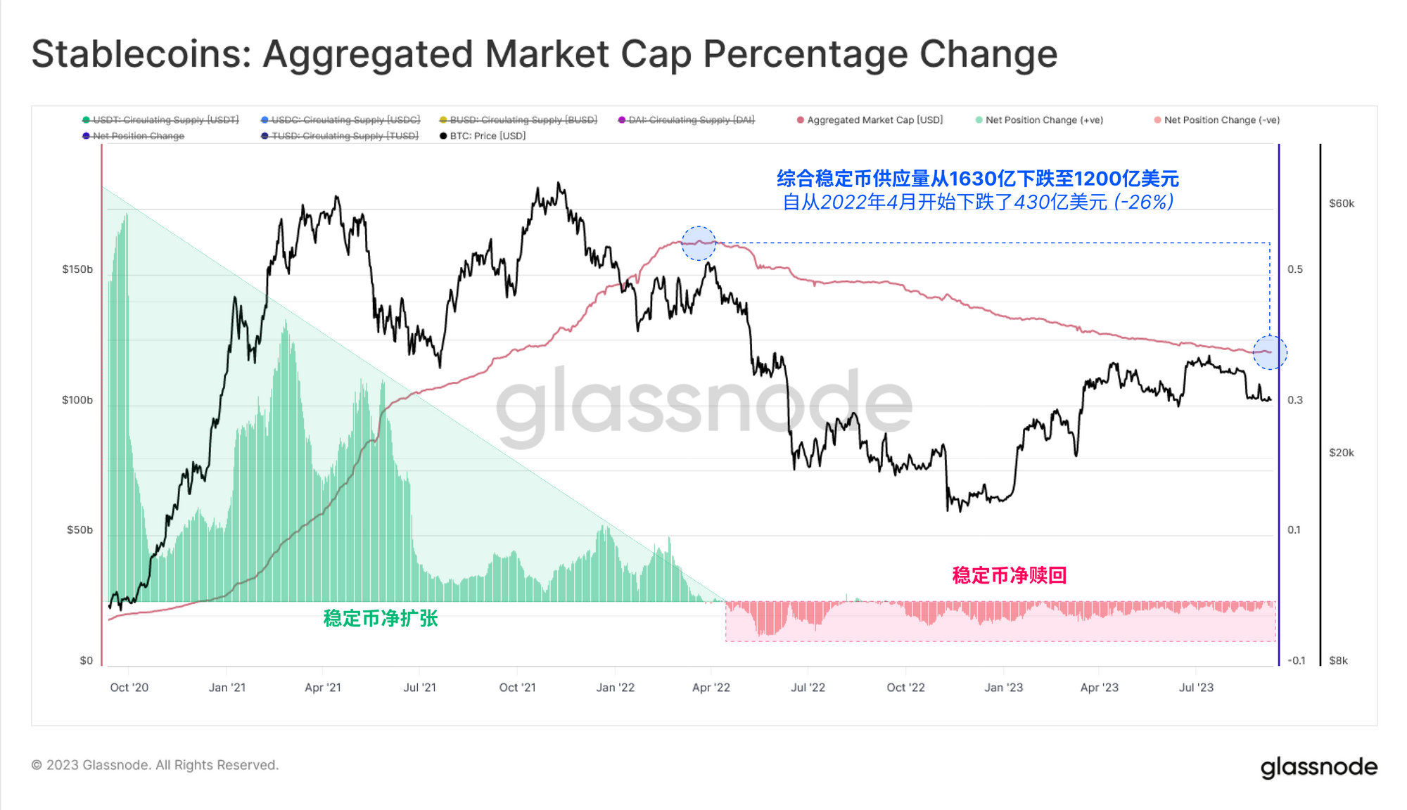 如果将稳定币单独列出,我们可以看到,共有430亿美元的资本被赎回,自2022年3月创下的高点以来,总计下降了26%。可以说,这既是熊市条件下资本离场的结果,也反映了较高利率的机会成本,而这种成本并没有转移到非收益型稳定币上。