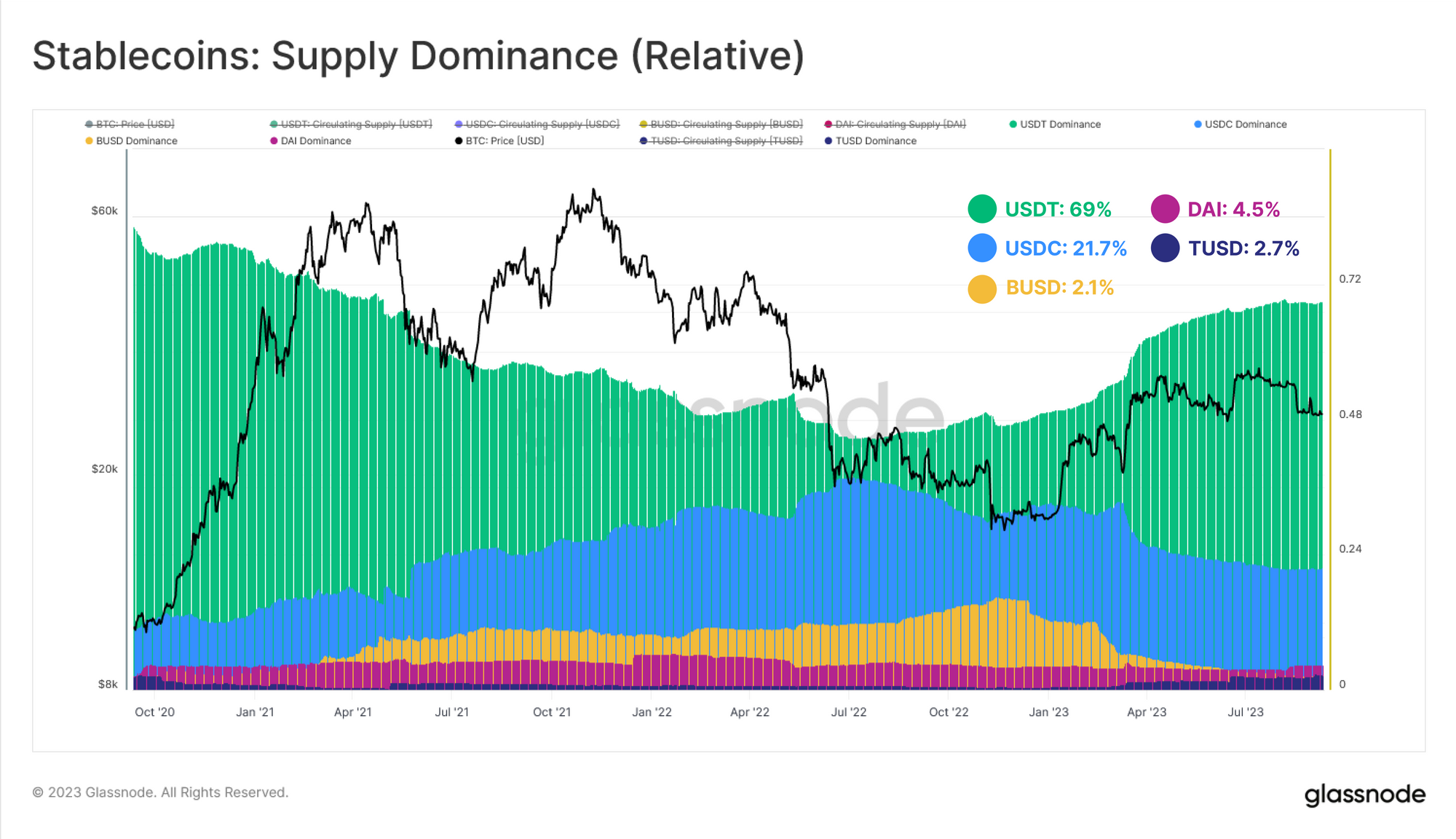 BUSD的主导地位下降到2.1%,USDC仅占21.7%,与一年多前达到的 38% 的峰值相比大幅下降。