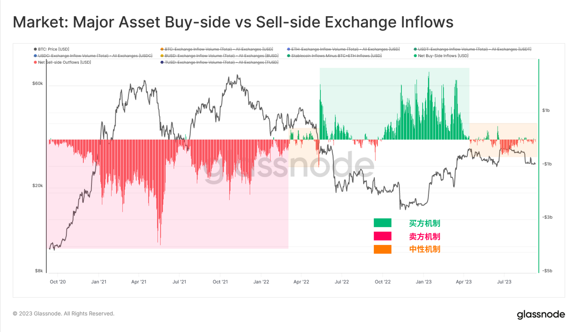 在更短的时间范围内,我们可以看看流入交易所的三大资产的买方与卖方的相对情况。在这里,我们做了一组简单的假设: