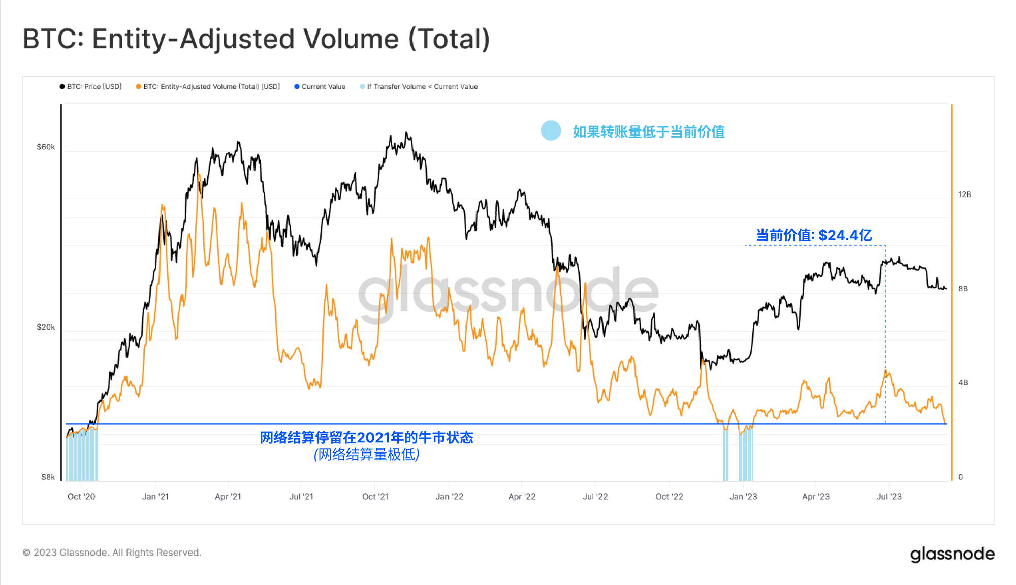 这种低流动性和低波动性环境也反映在比特币网络结算量上。比特币的美元换手总量(使用我们的实体调整聚类)在24.4亿美元/天的周期低点附近徘徊,并已回到2020年10月的水平。