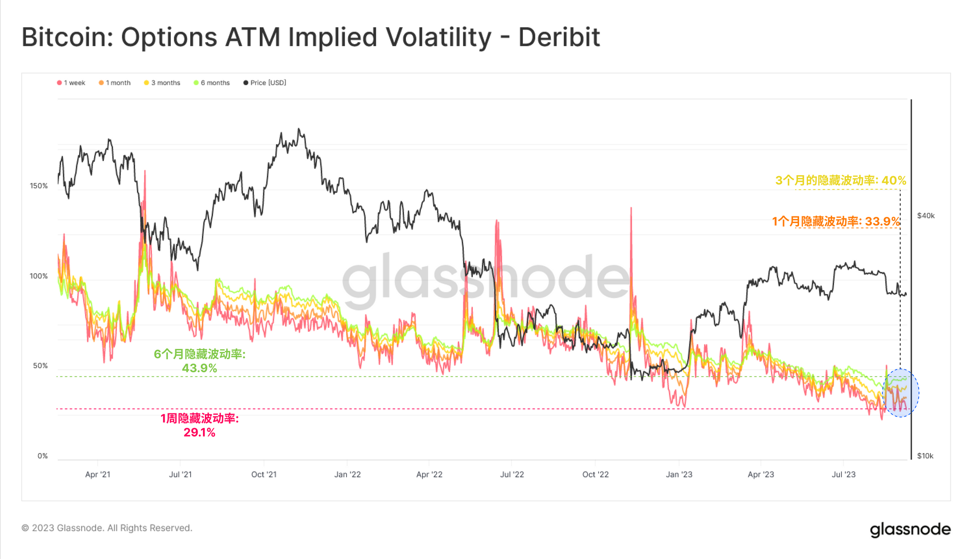 尽管在最近抛售至26000美元期间经历了波动高峰,并且在灰度在法庭上成功挑战SEC之后再次经历了波动高峰,但实现波动率仍然非常低。市场仍处于历史上的低波动环境中,这通常是未来波动加剧的前兆。