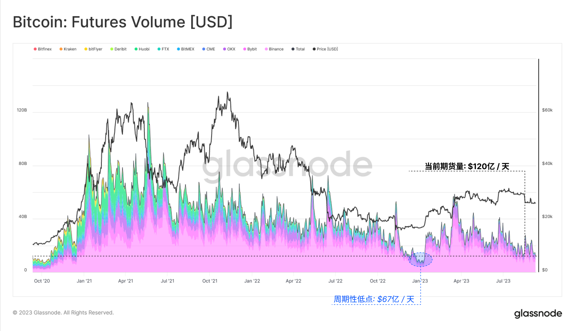 转到链下衍生品市场,我们可以看到期货交易量也遇到了类似的情况,达到了120亿美元/天的历史最低点。唯一一个交易量较少的时期是 2022 年底,当时比特币价格的交易区间维持在557 美元的范围内,持续了两个多星期(链上周报第2周)。