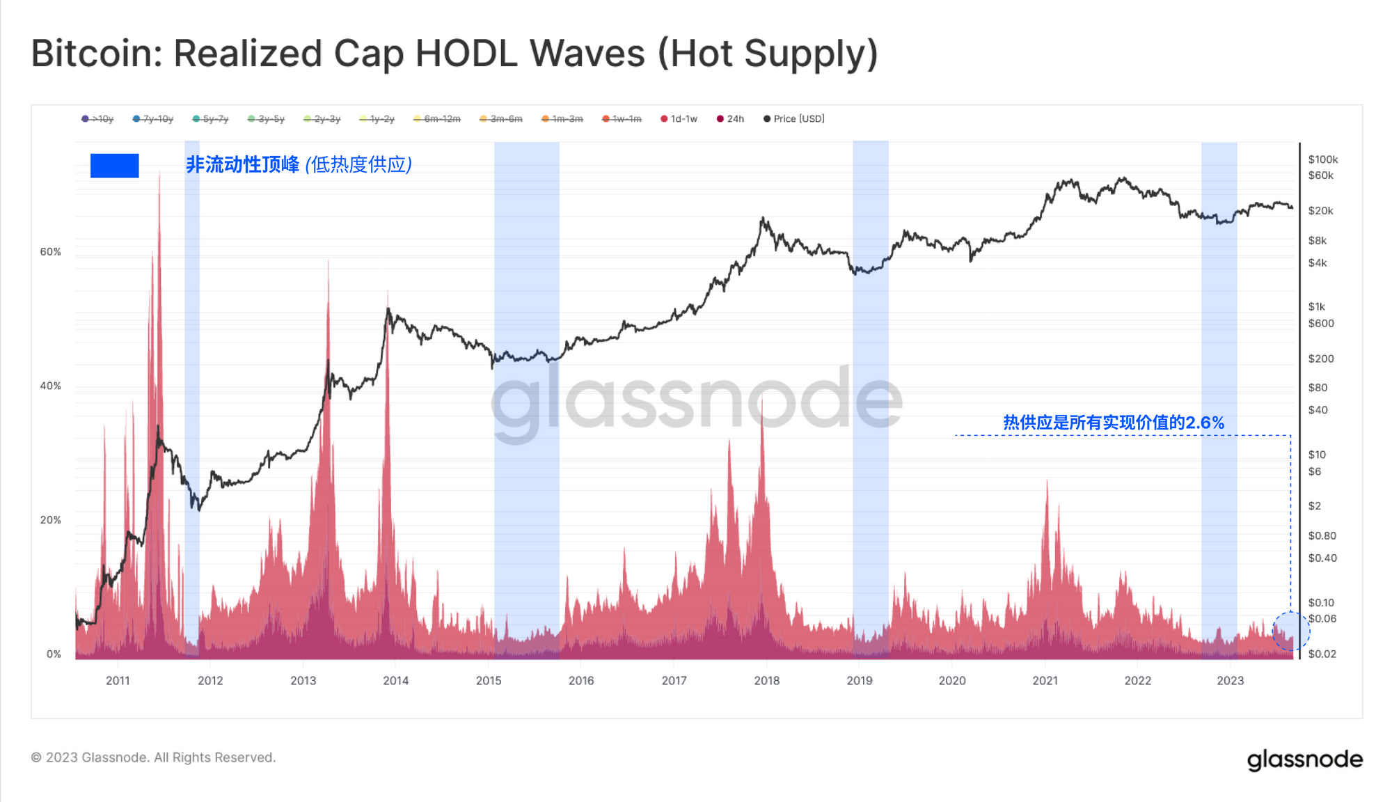 热供应 "类别中持有的已实现价值处于历史低位,这表明目前只有极少数币龄超过1周的币在交易。