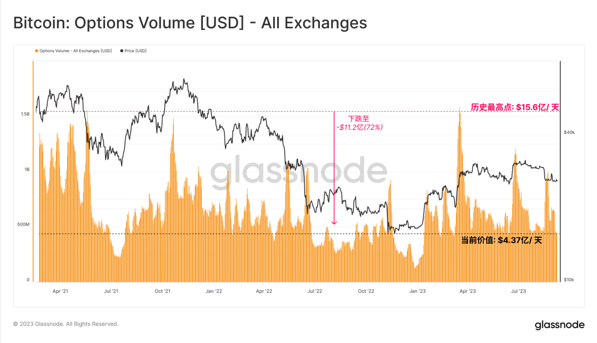 然而,我们注意到期权市场出现了有趣的分化,2023年的交易量显著增加,目前为4.37亿美元/天。这可能反映了在整体流动性收紧的时期,市场更愿意利用期权的杠杆作用和资本效率来表达自己的观点。