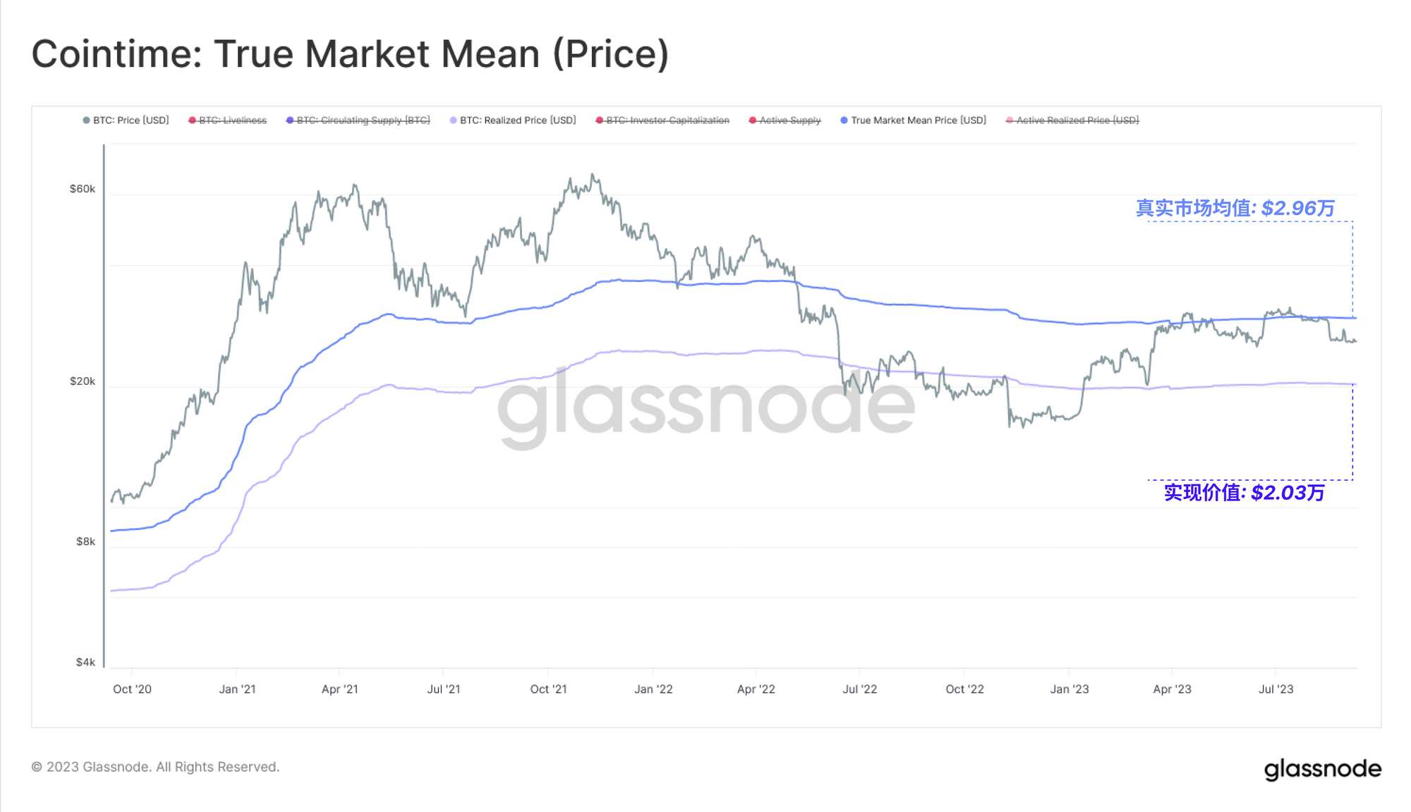 这项工作的一个重要启示是开发了真实市场均价,我们认为它是活跃比特币投资者最准确的 "成本基础 "模型。该模型目前位于2.96万美元,自今年4月以来已形成心理阻力位。传统的 "实现价格"(Realized Price)目前的交易价格为2.03万美元,这两个模型在很大程度上左右着这几年的价格走势。