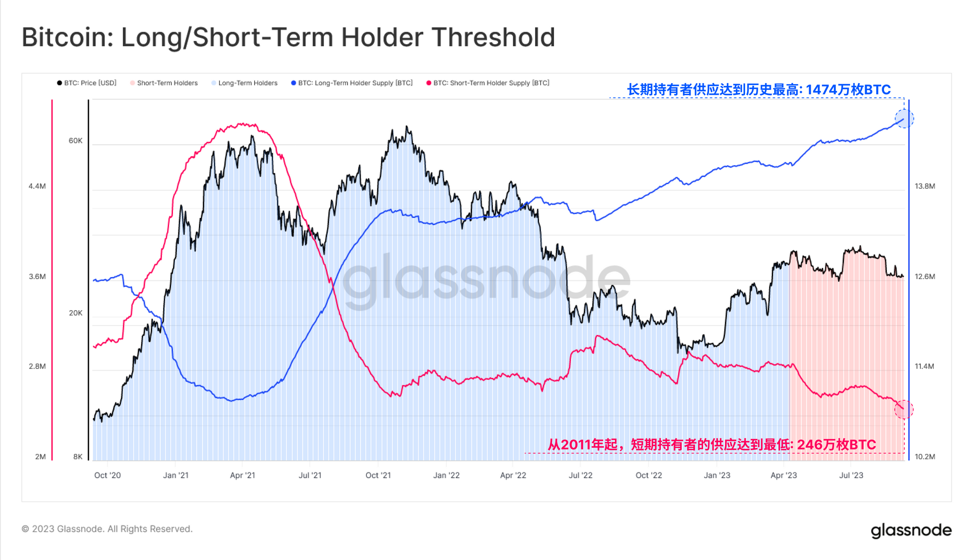 由于链上和链下领域都异常平静,长期持有者群组持有的供应量达到1474万枚比特币的新历史高点也就不足为奇了。与此相反,代表市场更活跃部分的短期持有者群组所持有的供应量却下降到了2011 年以来的最低水平。