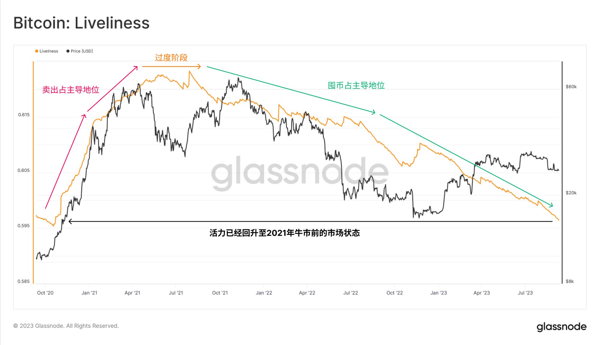 我们可以在 "活跃度 "指标中找到汇合点,该指标巧妙地比较了所有时间内 "币天销毁 "与 "币天创造 "之间的平衡。换句话说,活跃度代表了整个市场中 "投资者持有时间"的相对平衡。