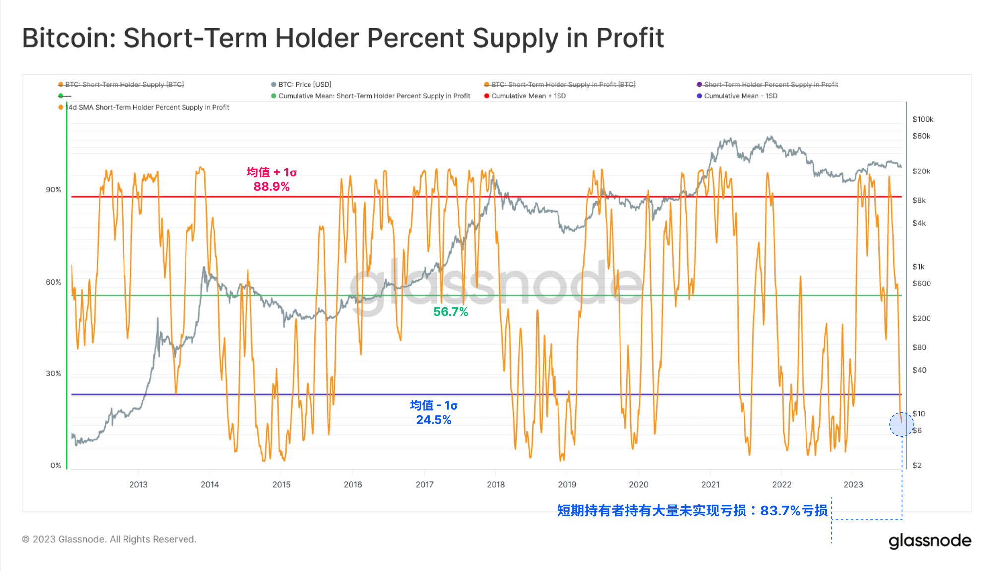 下图显示了短期持有者获利供应的百分比。我们可以看到,他们的绝大部分供应已陷入未实现的亏损,只有 16.3%的供应仍然 “处于盈利状态"。