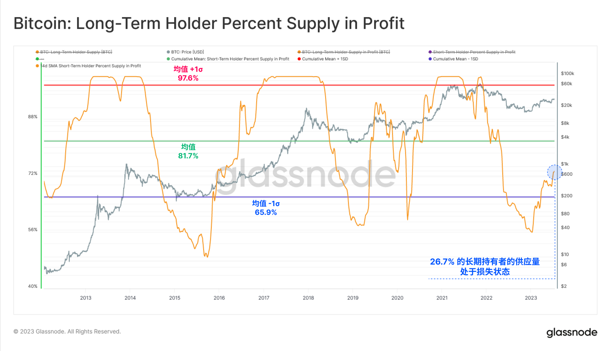 对于长期持有者群体来说,他们的盈利能力正在逐步提高,但仍处于历史低位,几个月前才脱离一个标准差(负值)区间。虽然这是一个建设性的趋势,但超过26.7%的长期持有者供应相对于其收购价格处于亏损状态,远低于历史均值。