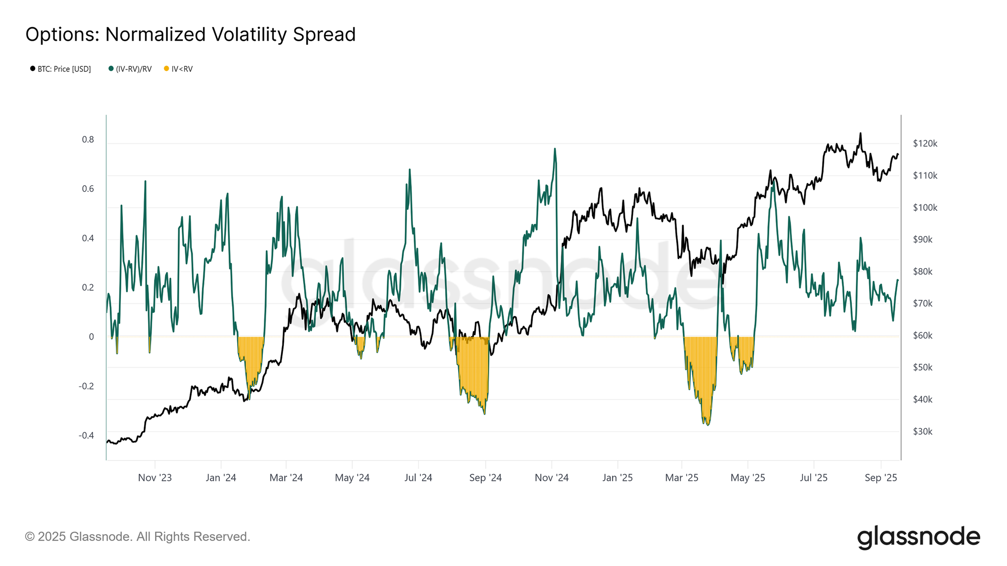整个9月,隐含波动率与实际波动率大部分时间保持紧密跟随,但在事件临近时大幅上升,因为做市商重新定价风险,交易者争相买入长伽马。标准化利差目前为0.228,仍处于正常区间内,但略有上升。这反映了伽马卖方为承担风险所要求的额外溢价,也在整体波动性低迷的环境中提供了收益机会。