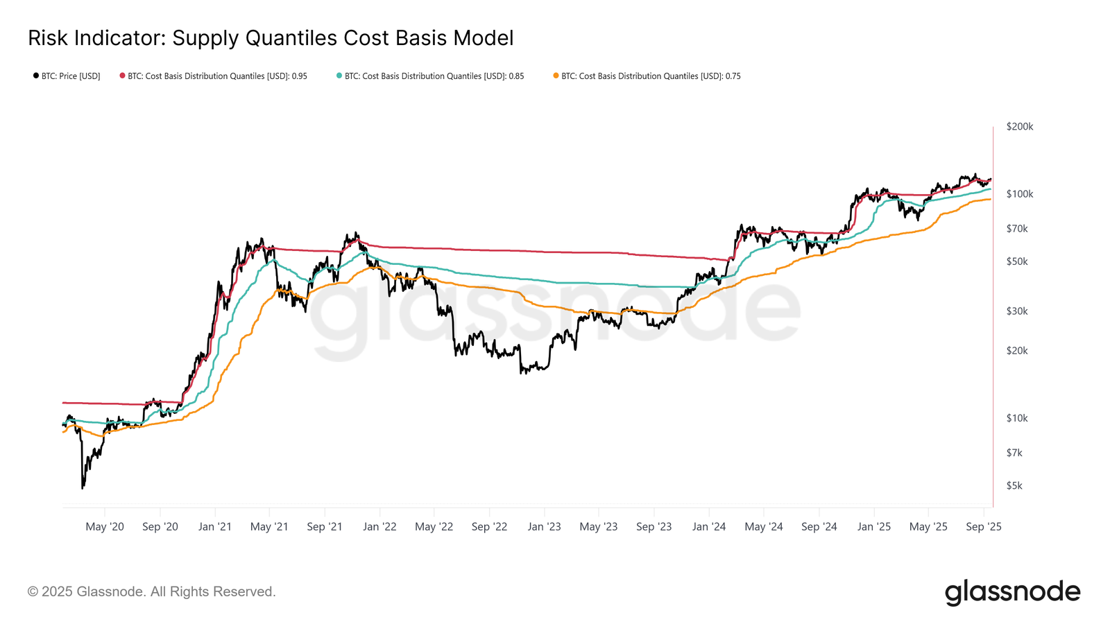 链上数据显示,比特币交易价高于95%供应的成本价,这一水平如今成为关键的分界线。维持在11.52万美元美元以上将支撑需求驱动的动能,而失守则可能回落至10.55万美元–11.52万美元美元区间。综合来看,这些信号表明市场正在等待确认:若能稳定在关键成本价水平之上,则可能进一步上行,而资金流的脆弱性则让下行风险依然存在。