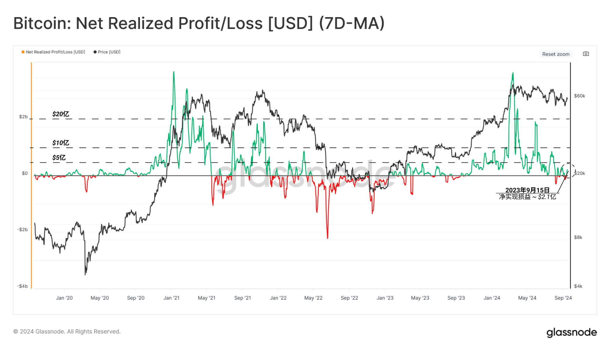 目前,我们可以看到盈利和亏损力量基本相等,导致净流动微小,并在零界限附近普遍波动。这暗示市场在一定程度上达到了平衡,与2023年8-9月期间有些相似。