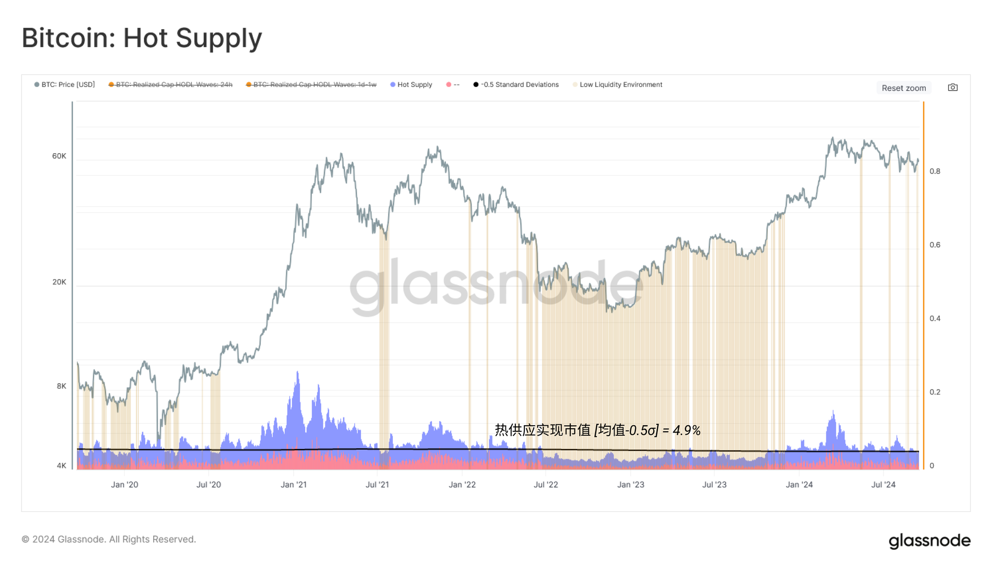 “热供应”指标是我们可以用来估计可随时交易和转账的比特币的一个代理。这一供应量代表了年龄在一周或更短的比特币所持有的财富。基于我们在长期和短期持有者研究中发现的假设,即市场中短期持有时间增加了比特币再次交易的可能性,我们认为这一独特年龄组是对市场波动最具反应能力的之一。