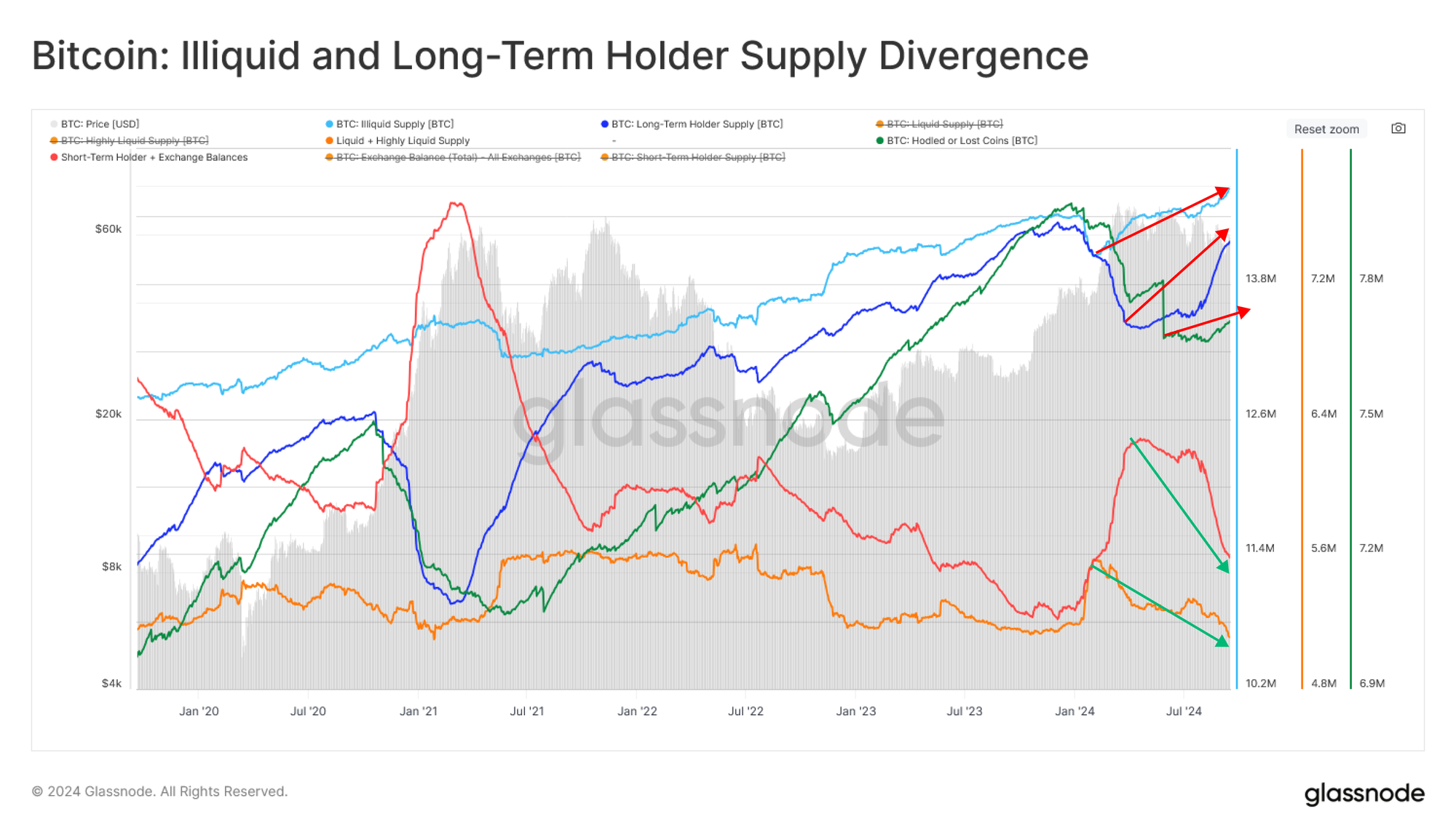 我们在供应分歧图表中看到了类似的故事。在这里,我们描述了几种“可用供应”的指标,如短期持有者和高流动性供应。我们将其与“储存或存储供应”的指标进行比较,如长期持有者或存储供应。