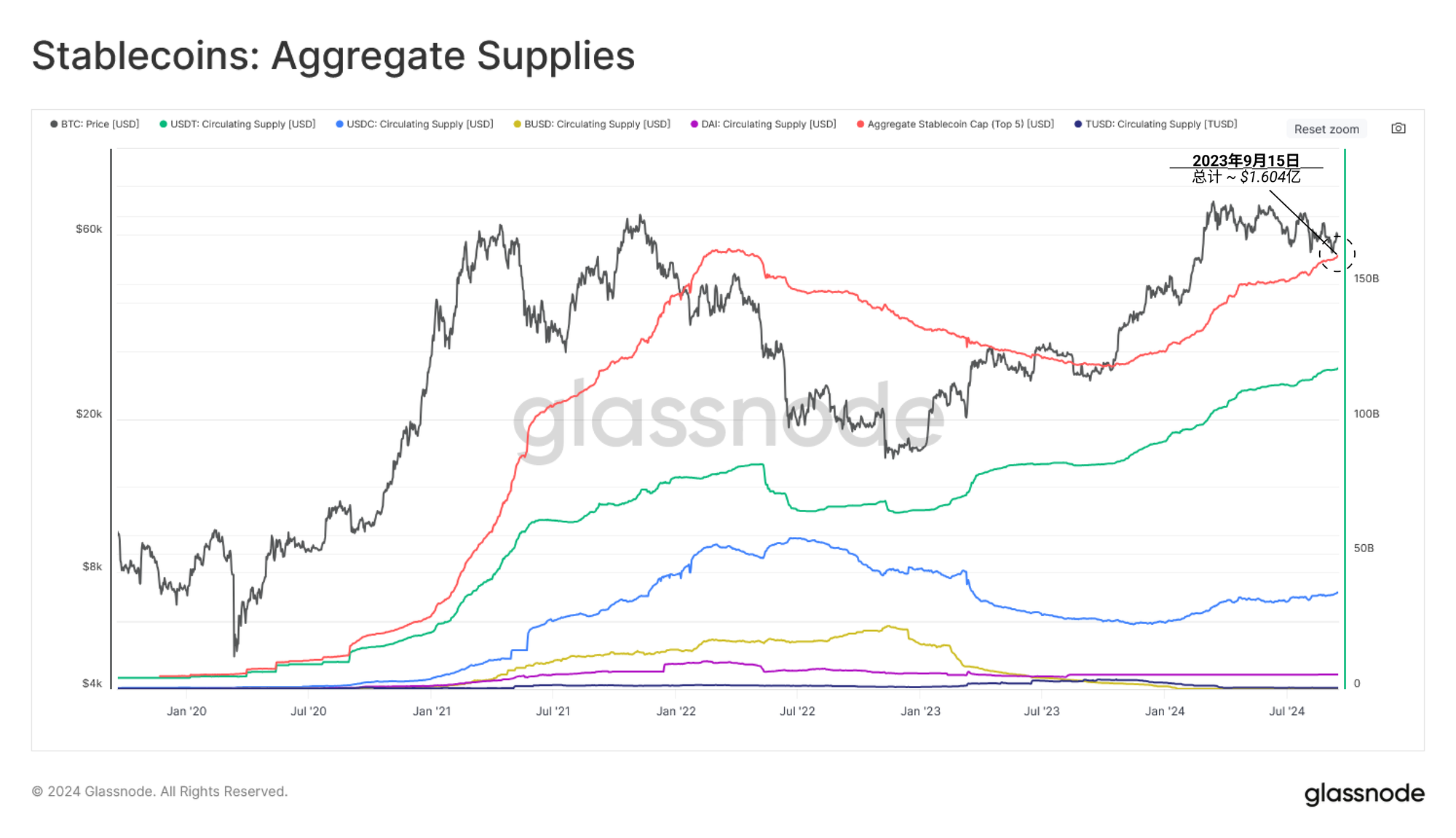 总稳定币供应量正在上升,目前接近历史最高点,达到1604亿美元。我们可以将此看为一个积极的信号,表明加密原生美元计价资本的积累,这些资本可以轻松兑换成数字资产。然而,我们也可以推断出,目前这些稳定币资本并没有积极地转向风险资产。