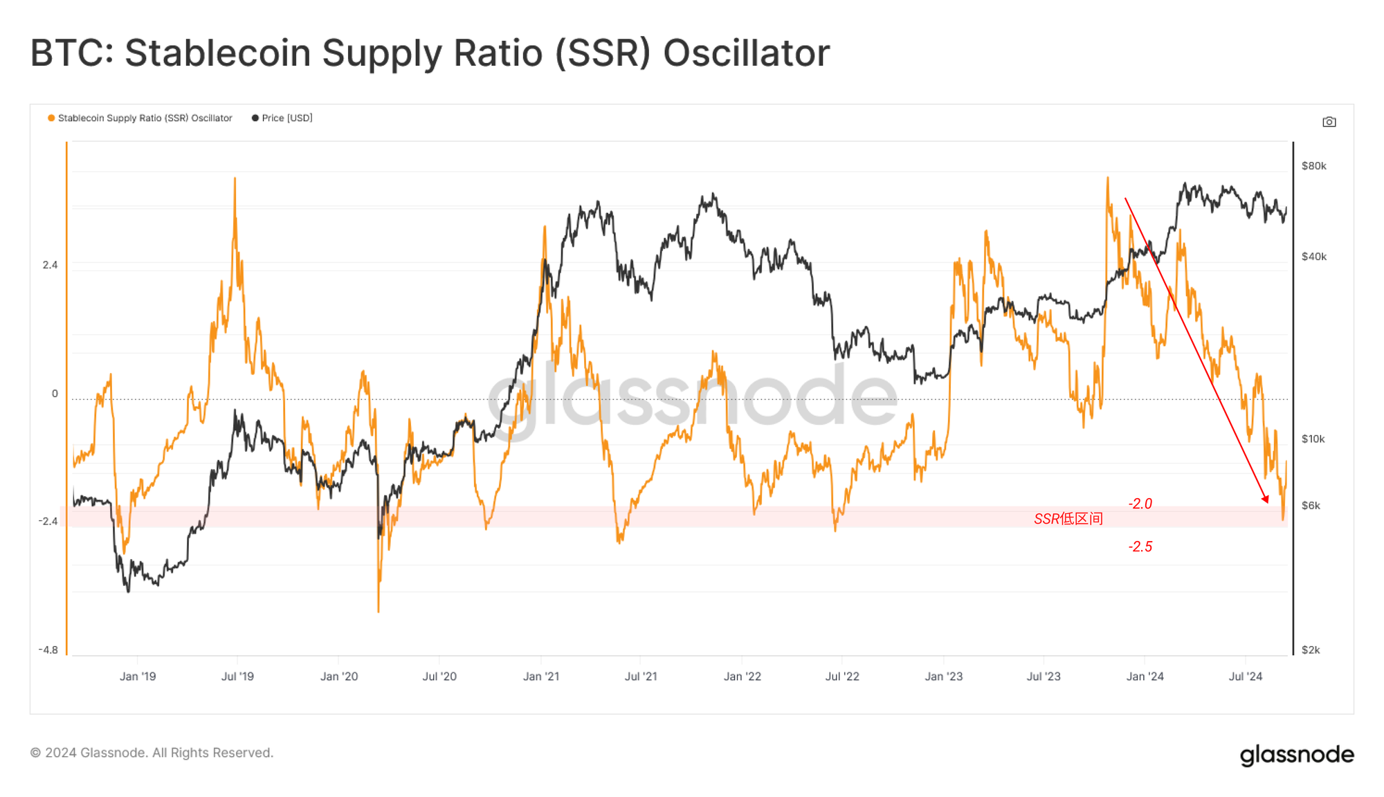 - 当SSR较低时,当前的稳定币供应量有更多的“购买力”来购买BTC。
