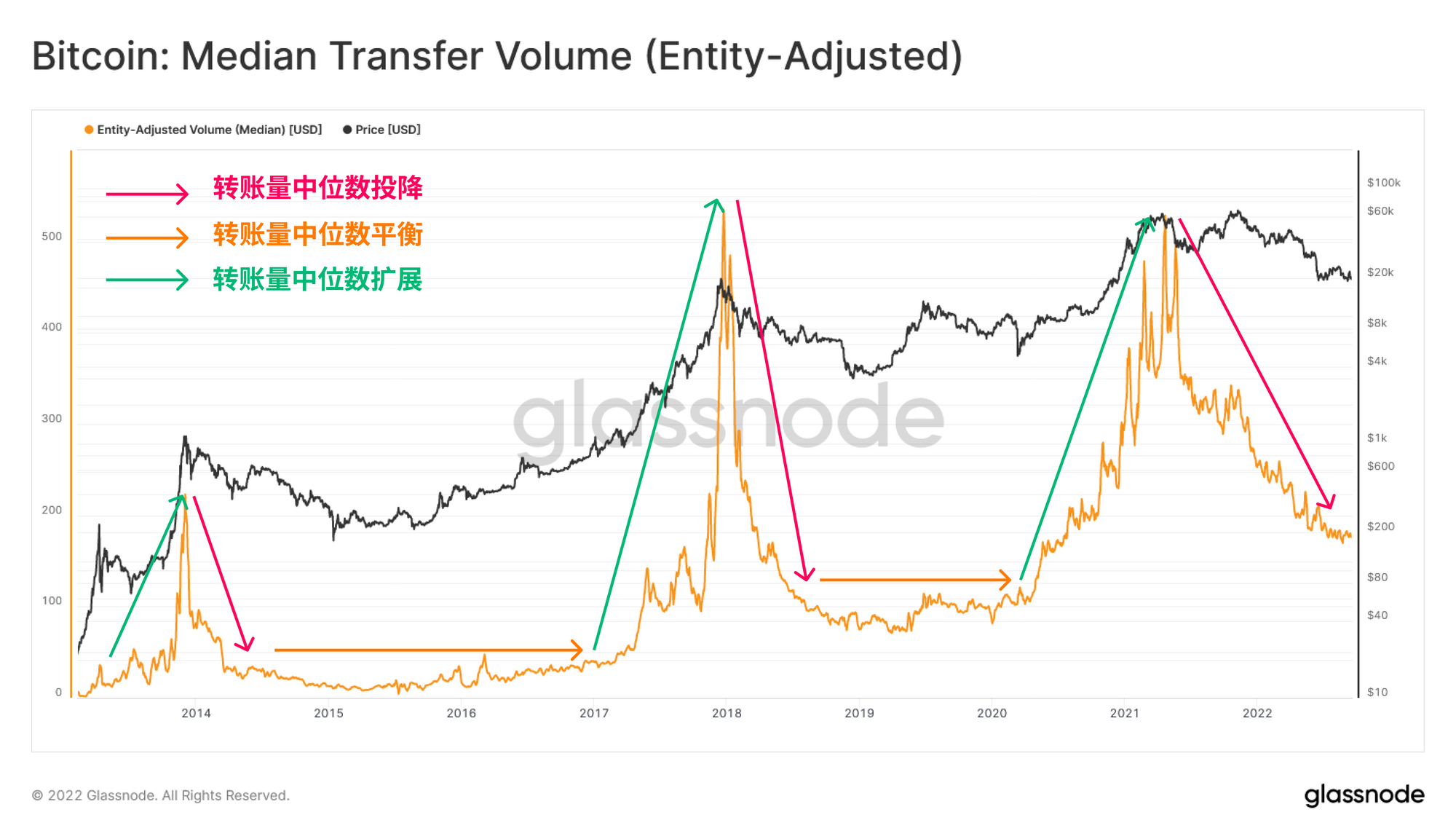 - 历史上,稳定的转账中位数发生在散户参与者被驱逐之后,这表明剩余的网络参与者(囤币党、职业交易者、大额资金)使用稳定。
