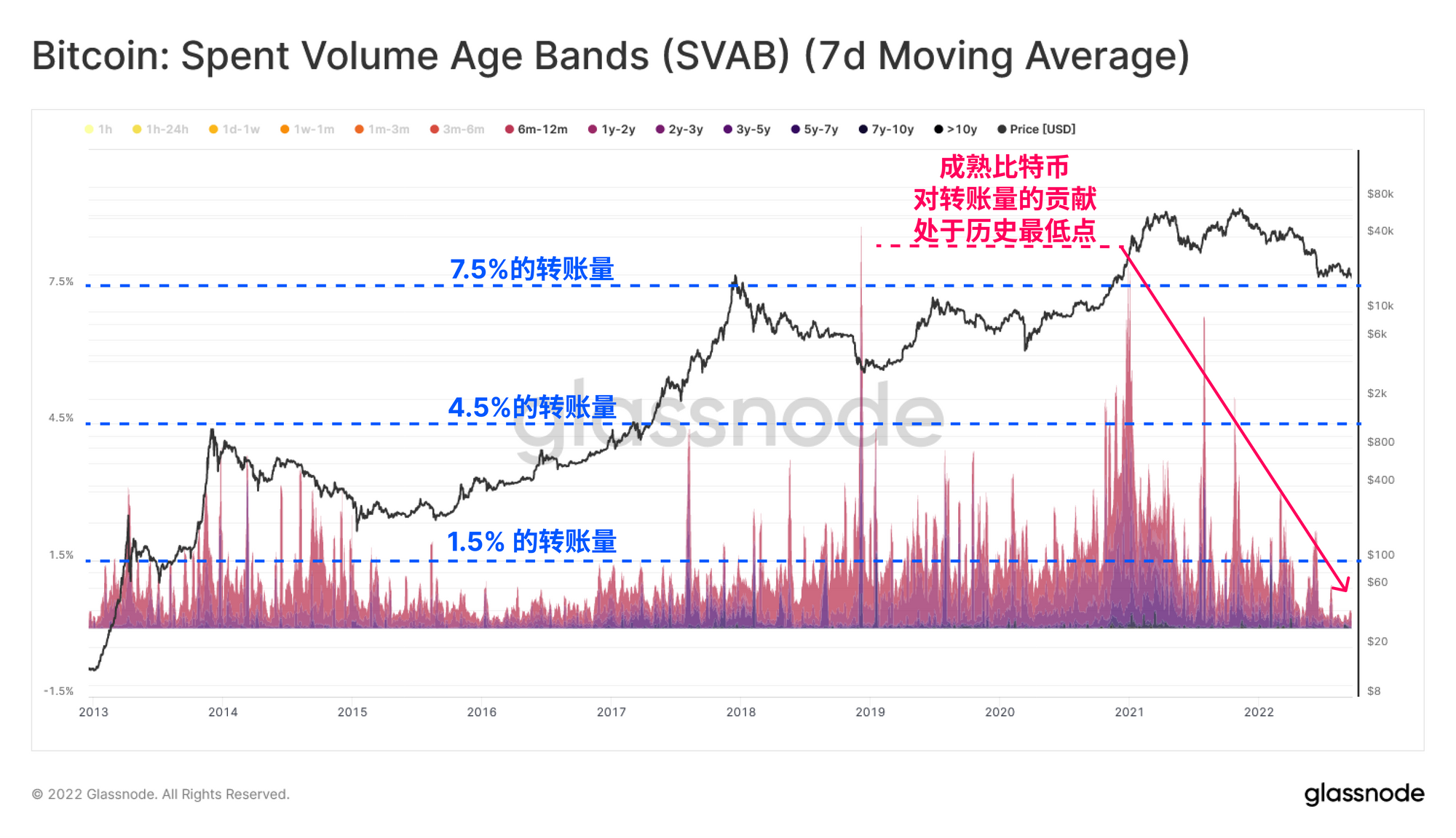 在这里,我们只分离出成熟状态(6个月以上)的比特币,这在当前的价格结构中显示了明显的压缩。成熟币被卖出的主导地位已经从2021年1月牛市高峰期的8%,崩溃到仅占所有交易量的0.4%。
