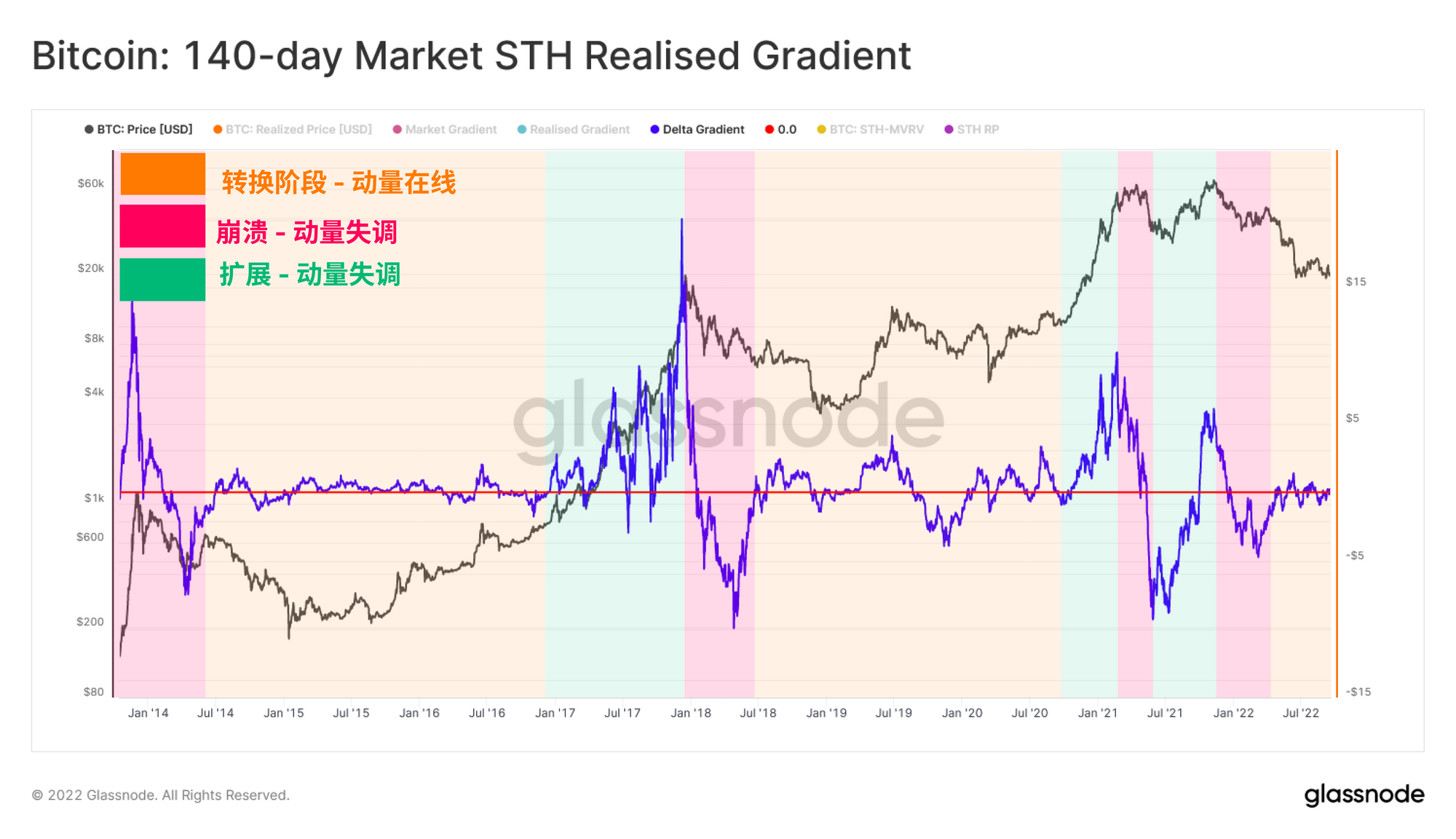 为了进一步分离短期持有者的行为,我们引入了一个专门与短期持有者相关的市场实现梯度振荡器的新变体(STH-MRGO)。这是一个统计学上的标准化震荡器,旨在衡量投机价值和短期持有者群组的真正资本流入之间的相对动力变化。同样,可以确定三个不同的阶段。