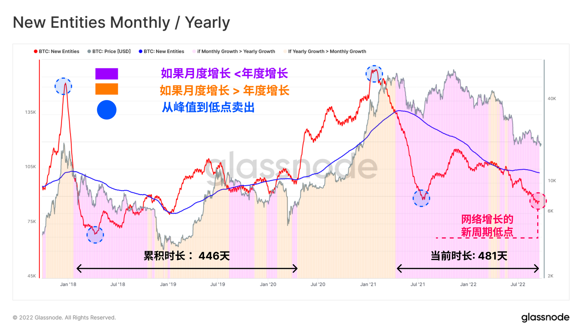 - 如果月度增长🟠<年度增长🔵 ,相对于长期的基线,我们可以认为网络采用正在收缩和恶化(如下图🟪所示)。