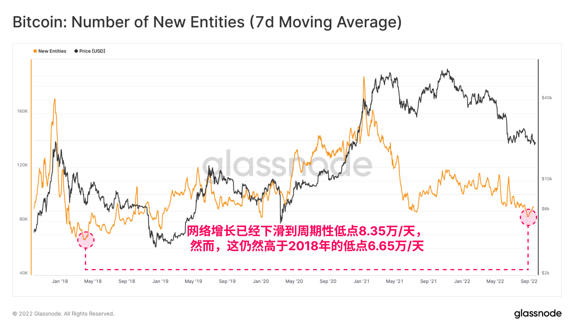首先,我们将探索新实体指标,这是一个衡量网络采用情况的指标,该指标能够估算出比特币网络上进行交易的新的单一实体的最准确数量。通过这个指标,我们可以看到每天约有83.5万个新增实体,这是2020-22周期的宏观新低,但仍然高于2018年熊市的低点,后者曾创下每天66.5万个新实体的最低记录。
