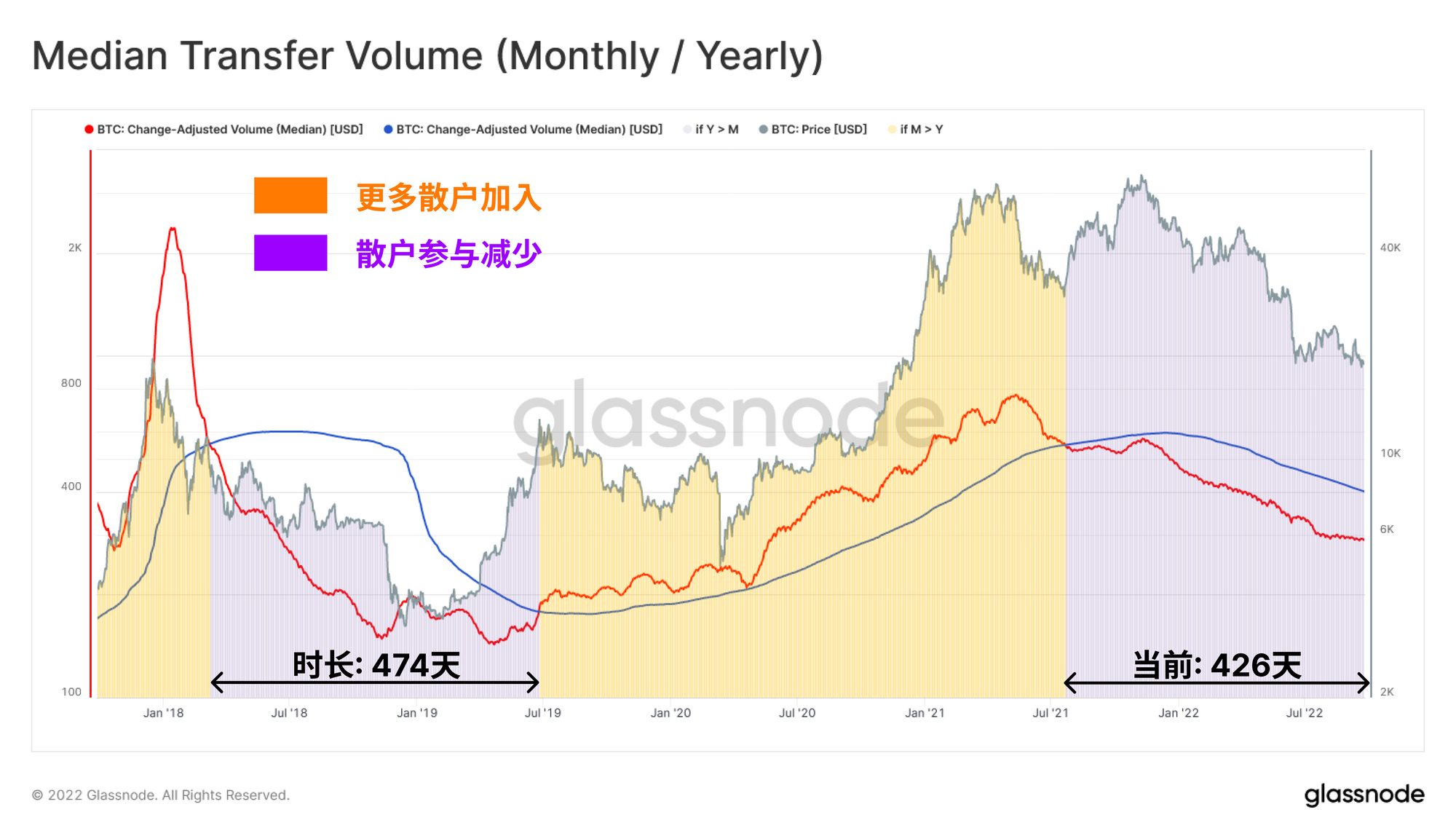 在矿工大迁徙之后🟪,我们观察到一个驱逐散户的时期,现在这个时期已经持续了426天。这与2018年熊市期间观察到的散户投资者清洗持续时间相似,后者持续了474天,然后月均值才恢复到年均值以上。