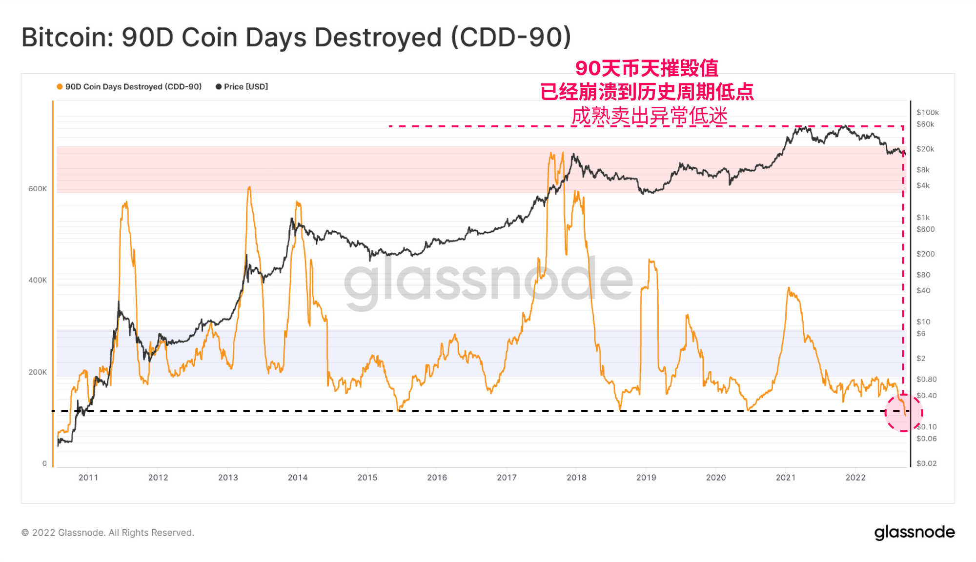 实体调整的90天销毁的比特币天数(CDD-90)指标评估了90天内的比特币天数销毁的总和,有助于我们直观地看到币龄支出较高和较低的时期。