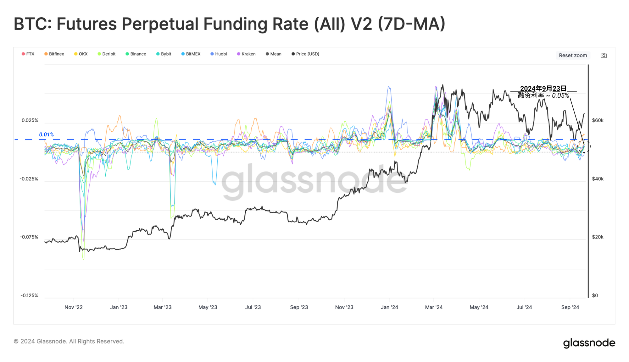我们可以通过永续期货市场为我们对新资本在上涨趋势中信心的调查添加另一个维度。首先,我们使用期货永续资金费率(7天移动平均)来展示投机者支付更高利率以获得做多杠杆的意愿。