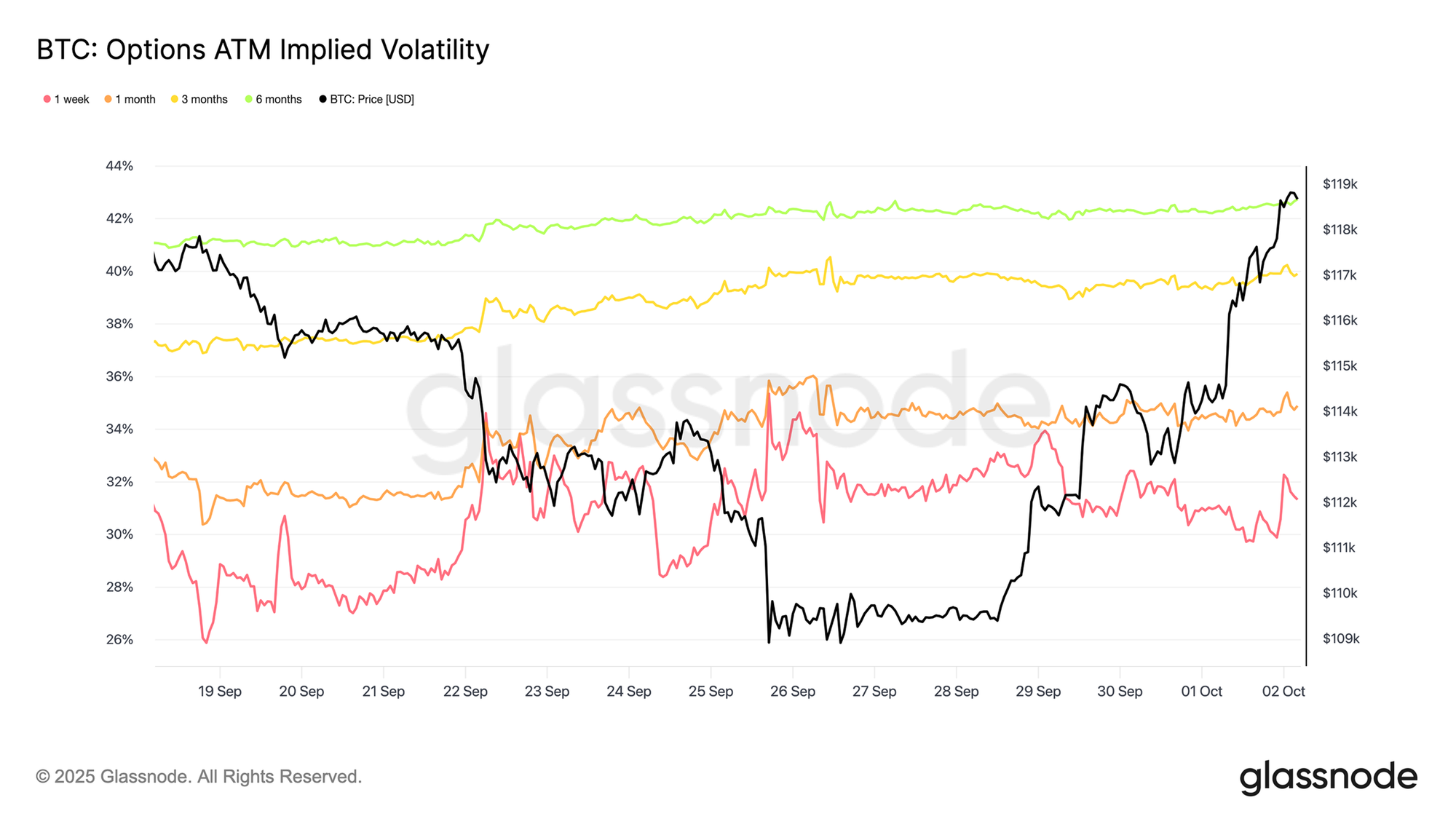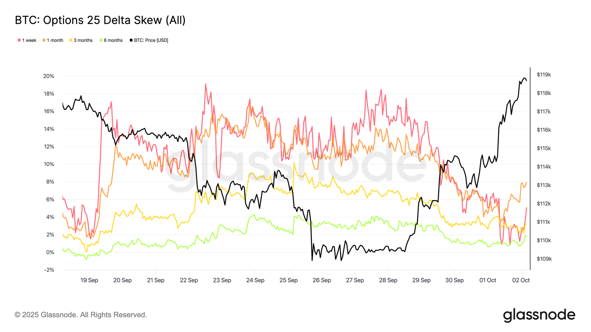 - 资金流显示谨慎的上涨兴趣,交易者增加了风险反转和低成本凸性,同时卖出认沽期权。这种仓位布局反映了与季节性 “Uptober” 动态一致的谨慎乐观。