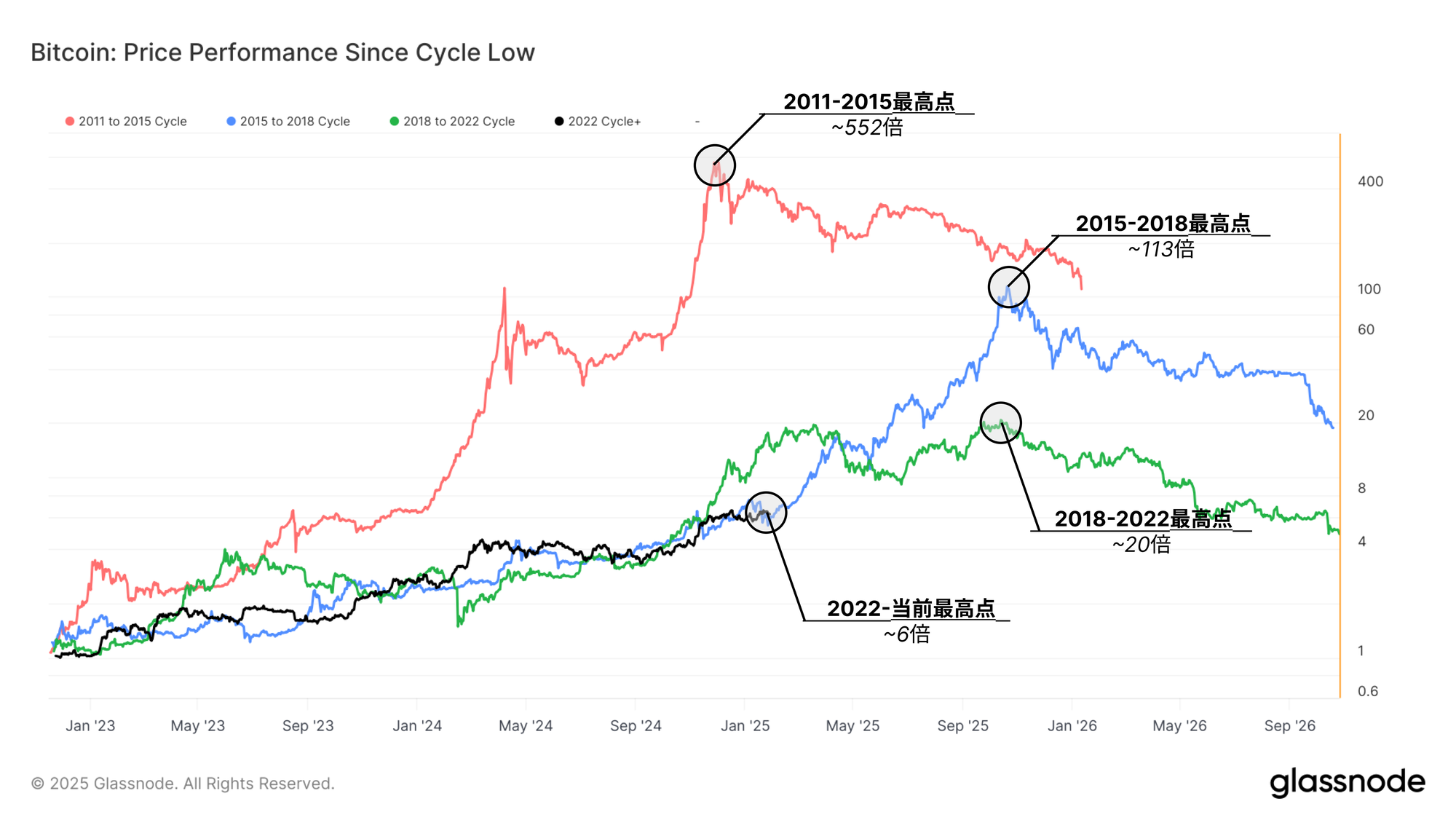 2023-2025年周期相对于2022年底设定的低点的位置,符合可能进入第二个狂热阶段的过渡。先前的两个周期在此时都出现了价格表现的显著加速,主要由新关注和对资产需求的涌入驱动。